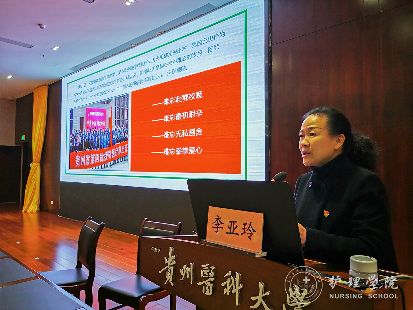 此次疫情突然爆发,对护理人员来说是一场从未经历过的大考,在整个抗击新冠肺炎的过程中,护理人员发挥了举足轻重的作用。李亚玲用了“四个难忘”来回顾了在援鄂45天中的所见所闻、所思所想:难忘赴鄂前夜、难忘最初艰辛、难忘无法割舍、难忘拳拳爱心。在报告会过程中,她还分享了附属医院护士李红、刘芳等前线抗疫英雄的抗疫日记,在座的师生深深感受到到前线抗疫人员的艰辛与苦难、无畏与担当。一个个鲜活的故事,催人奋进,令人感动,给人力量。李亚玲谈到:此次抗疫中深深体会到了我国社会主义制度的优越性,见证了中国速度、感受了中国温度,相信在以习近平同志为核心的党中央的统一领导下,我们的国家会越来越强大。