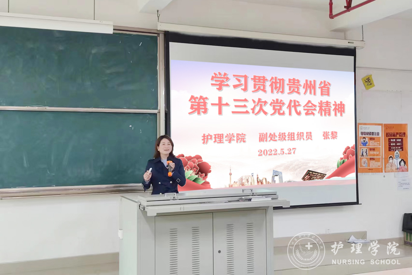 5月27日,为深入学习贯彻中国共产党贵州省第十三次代表大会精神,williamhill中国官网入口党委委员、副处级组织员张黎在北校区4201教室为护理学2019级甲班和公司第12期发展对象培训班学员进行了大会精神宣讲。