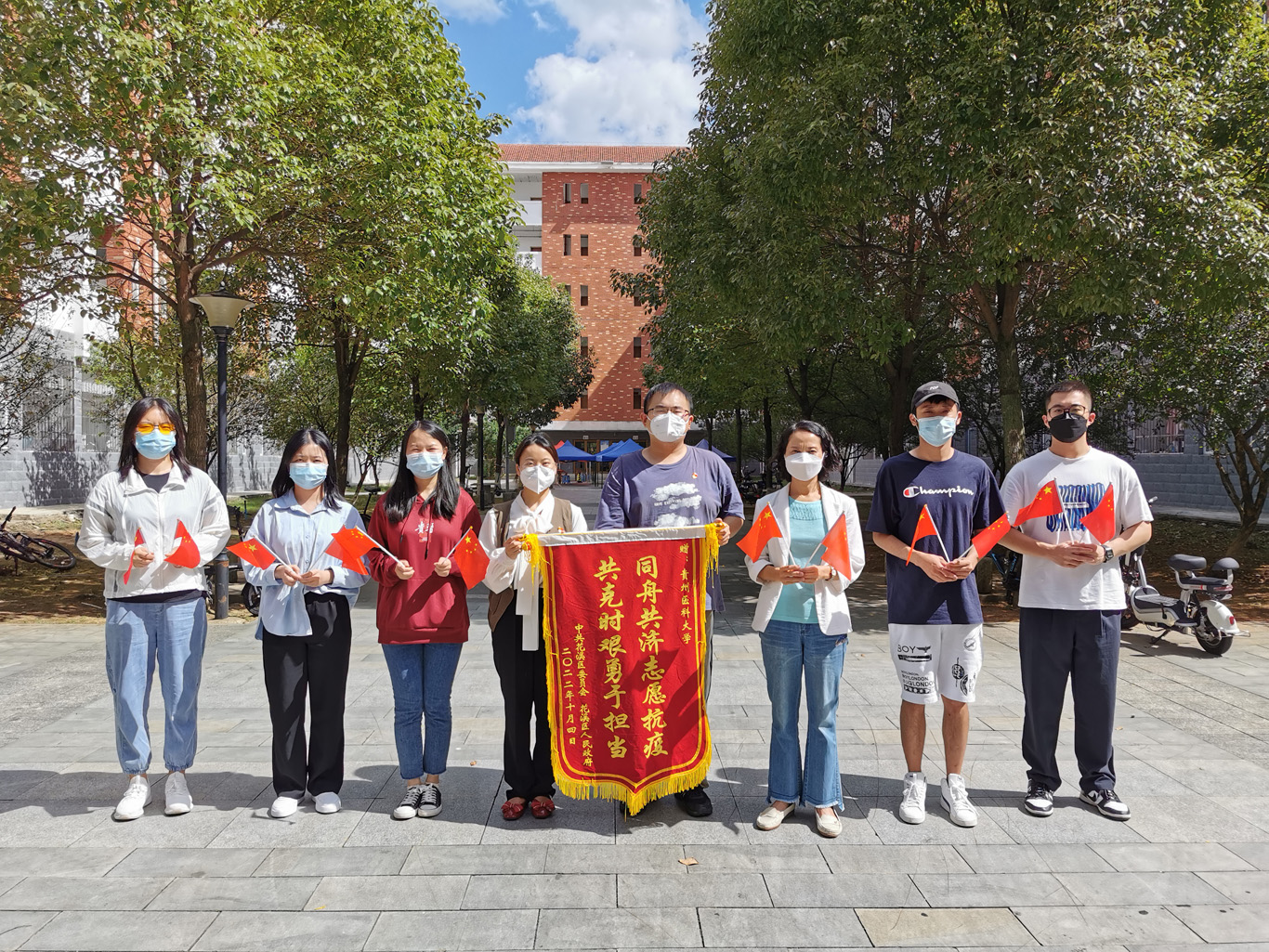 增援核酸采样辅助工作期间,师生们每天不畏艰苦、坚守岗位,科学、高效、细致、安全地完成了上级布置的各项工作任务,获得了各增援点党委、政府和居民的一致好评,收到了中共花溪区委员会、花溪区人民政府赠送的“同舟共济志愿抗疫,共克时艰勇于担当”锦旗。