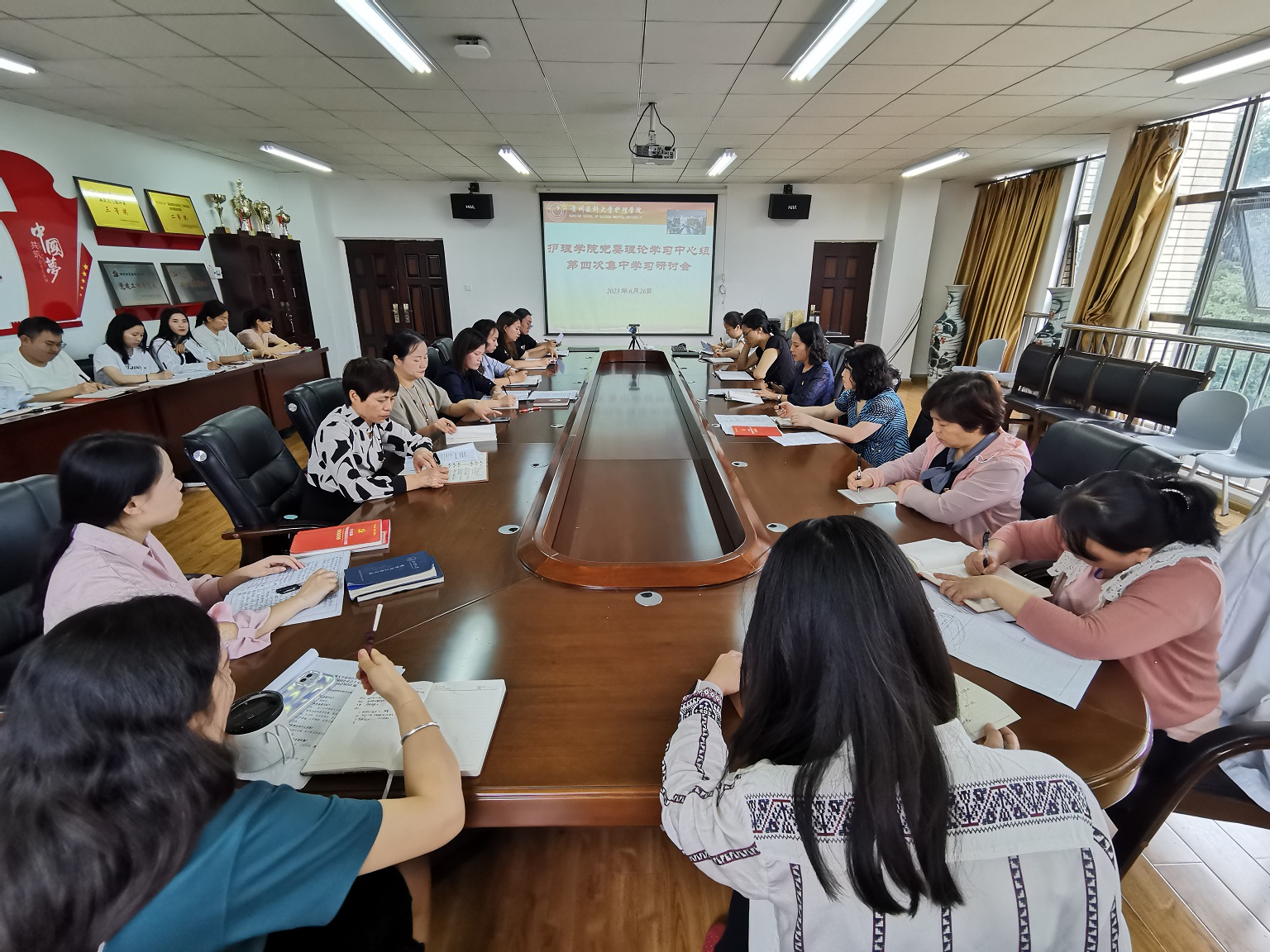 6月26日,williamhill中国官网入口在南校区百川楼五楼会议室开展党委理论学习中心组第四次集中学习研讨,公司党委委员、副科级以上干部、党支部书记和全体辅导员参加,会议由公司党委书记杨英主持。