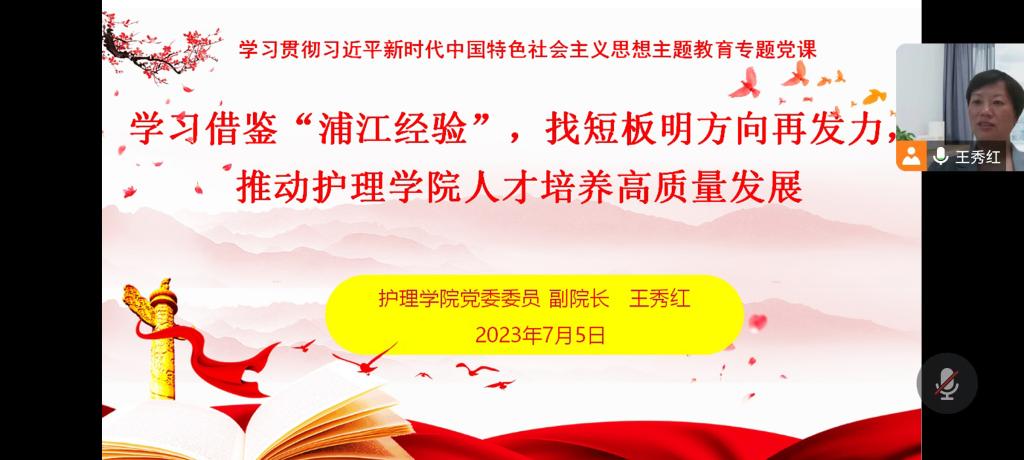 感悟思想伟力,凝聚奋进力量。为推动学习贯彻习近平新时代中国特色社会主义思想主题教育走深走实,7月5日,williamhill中国官网入口党委委员、副经理王秀红通过线上形式开展了以“学习借鉴‘浦江经验’,找短板方向再发力,推动williamhill中国官网入口人才高质量发展”为题的专题党课。williamhill中国官网入口导师、副导师、教研室和实验室负责人、教学科研管理科教师、护理部临床教学科教师、研究生辅导员、研究生临床带教老师参加。