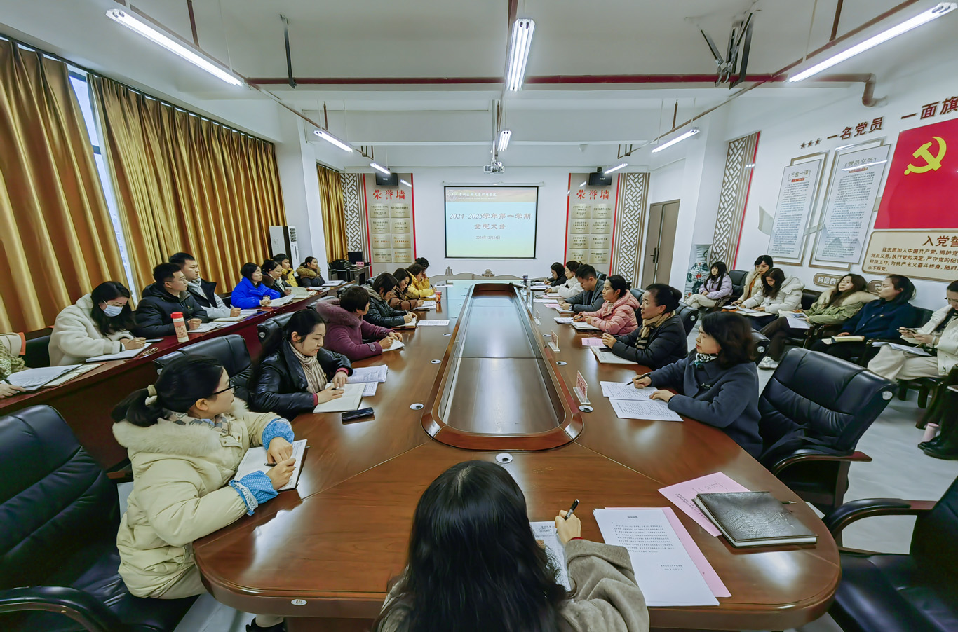 12月24日,williamhill中国官网入口在云漫湖校区酬勤楼六楼会议室召开期末全院大会,会议由公司党委书记杨英主持,全院教职工参加。