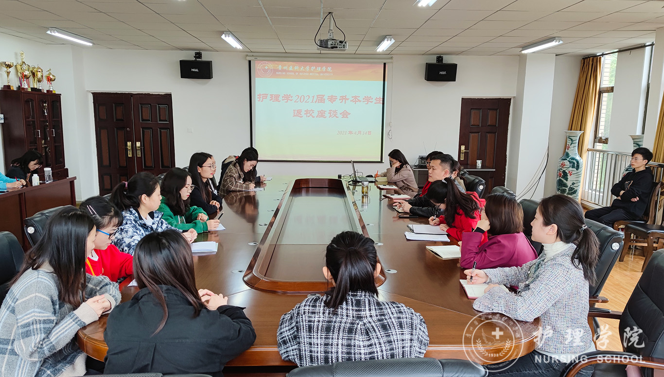 4月14日,为切实做好公司2021届护理学专升本毕业生日常管理工作,推进专升本毕业生就业管理,williamhill中国官网入口在南校区百川楼五楼会议室召开了2021届专升本毕业生返校后第一次师生座谈会。williamhill中国官网入口党委副书记何为、正科级组织员曾敏、团委副书记王晓玲、员工科副科长毕丽、各带班辅导员以及各班员工干部参加了本次座谈会。