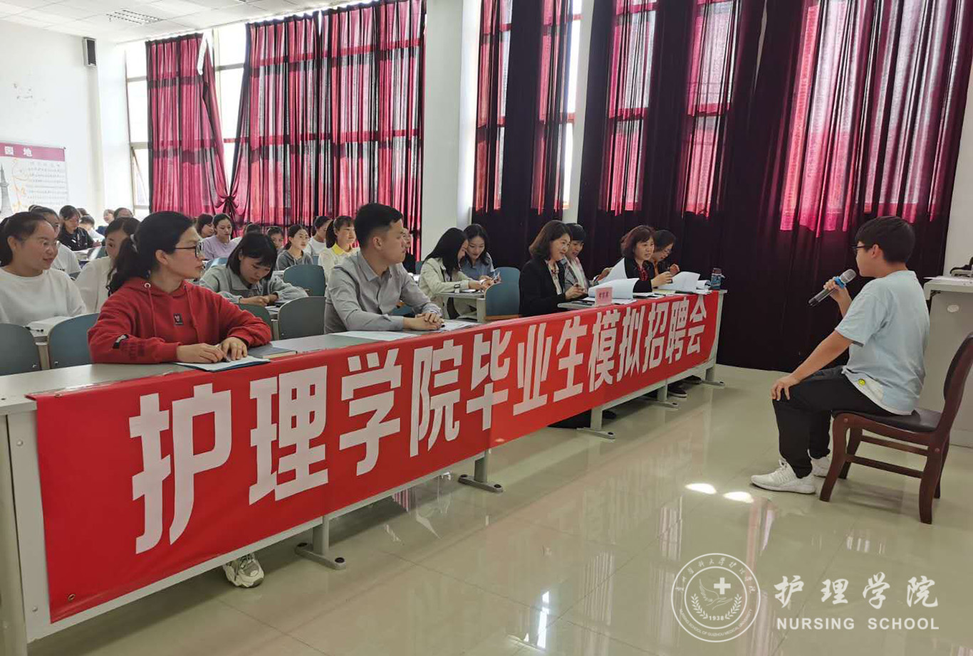 本次面试包括自我介绍、现场提问、现场演示三个环节。同学们用简单明了、真诚坦率的言语向面试官介绍了自己的专业能力和老员工活。面试官从应聘相关科室的原因、医患关系的处理、护士核心素质的理解、突发状况的处理等方面对员工进行了提问与点评。护理人文教研室主任张仁莉老师向员工现场演示面试仪容仪表,包括站姿、坐姿、走姿、神态表情等细节,让同学们受益匪浅。