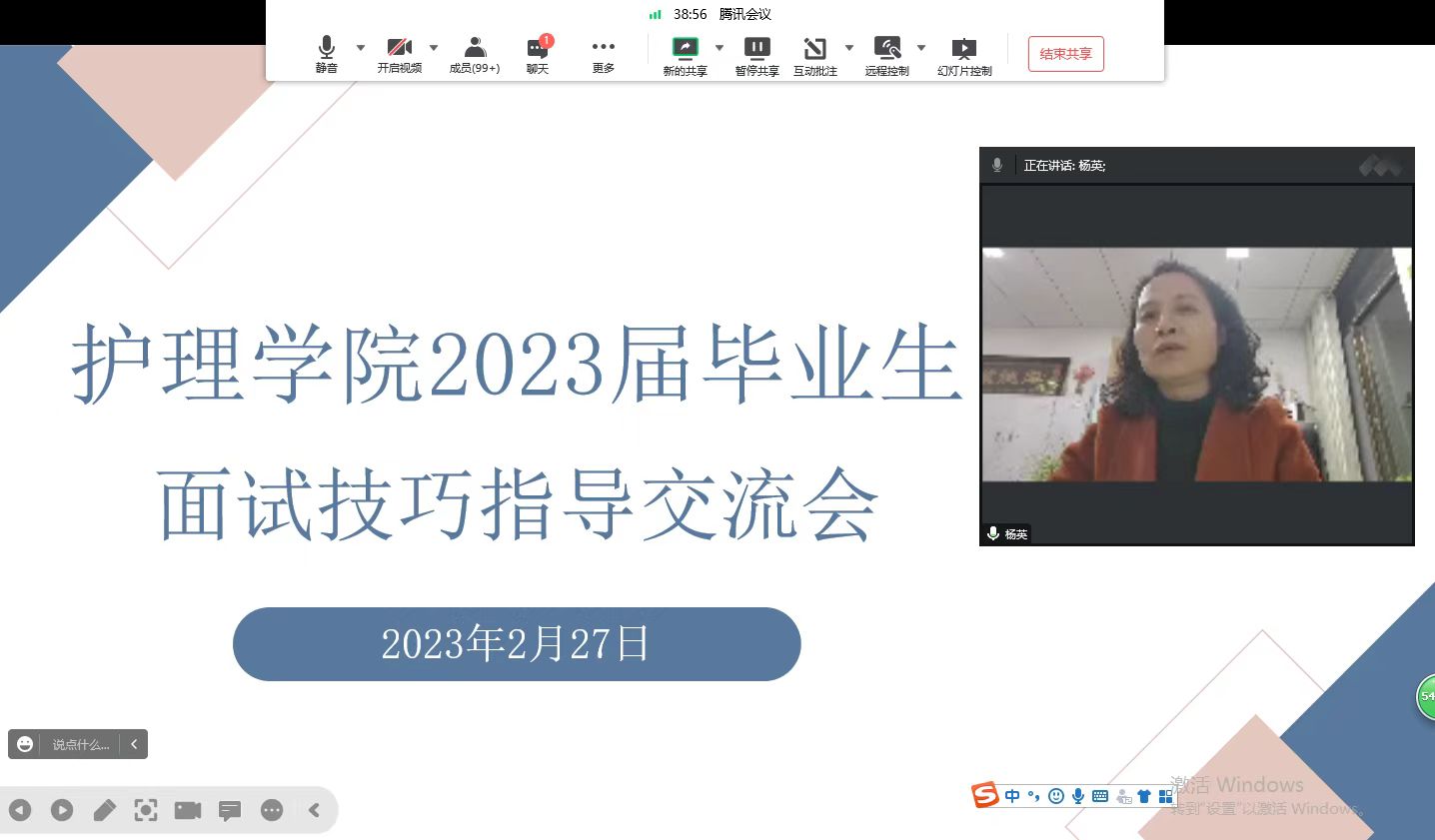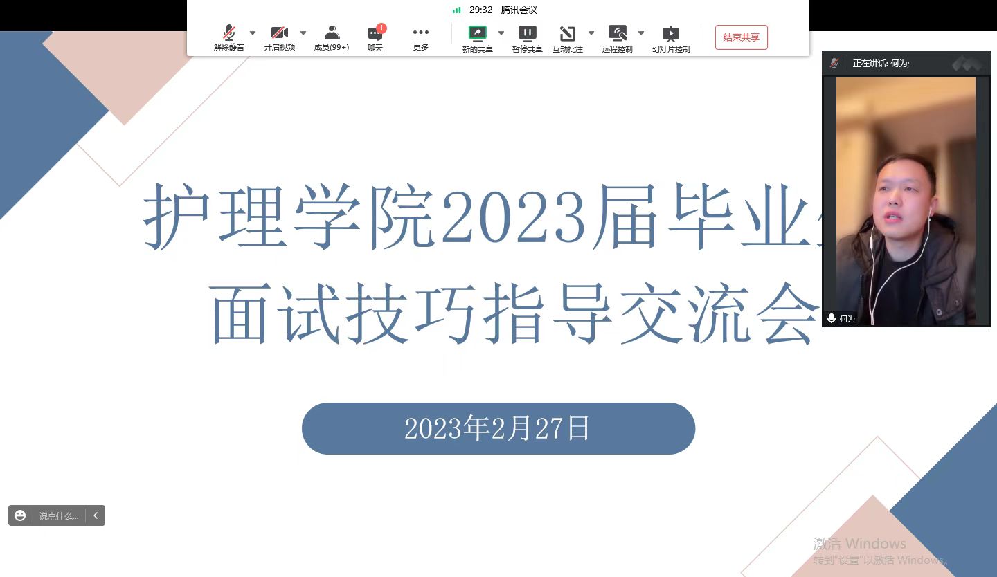 首先,公司邀请现就职于贵州省人民医院的公司2022届毕业生(刘滔、王玉清)分享了招聘面试经验。紧接着,何为围绕当前就业形势、增强就业信心和面试技巧给同学们进行全方位的的就业指导。他指出,同学们要端正就业态度,充分准备,以饱满的精神状态积极就业。最后,杨英强调并提要求,希望同学们一要做好时间规划,夯实专业技能的同时更要提升就业面试技巧;二要做好职业规划,学会自觉考虑职业方向、目标和路径,有效提升就业能力;三要树立正确择业观、就业观,科学把握就业方向和职业目标,为将来走上工作岗位后摆正工作态度、提升工作业绩打下坚实基础。