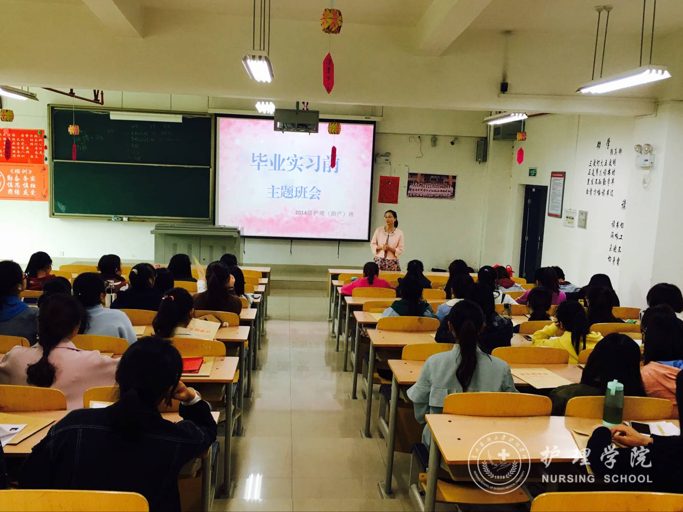 4月12日,williamhill中国官网入口在北校区4401教室毕业实习前主题班会, 2014级护理学(助产)专业的班主任徐锟老师主持了此次班会, 2014级护理学(助产)的全体同学参加。