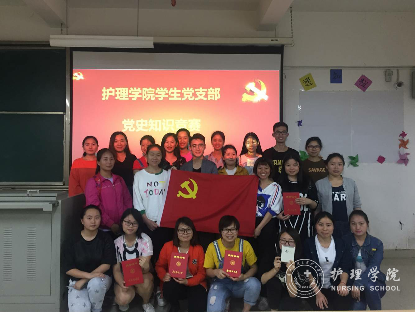 比赛分为抢答题和必答题两个环节。第一环节是抢答题,在场的党员同学均可举手抢答,答对者即可为班级党小组增加积分;第二环节是必答题,由各班党小组选拔推荐三位代表进行参赛,每队回答三个必答题,场上角逐激烈,一次次将赛场气氛推上高潮,台下的观众们都积极踊跃参与到活动中来。经过激烈的比拼,2014级护理专升本甲班党小组获得第一名,2014级护理本科班党小组和2014级护理专升本乙班党小组分获第二、三名。