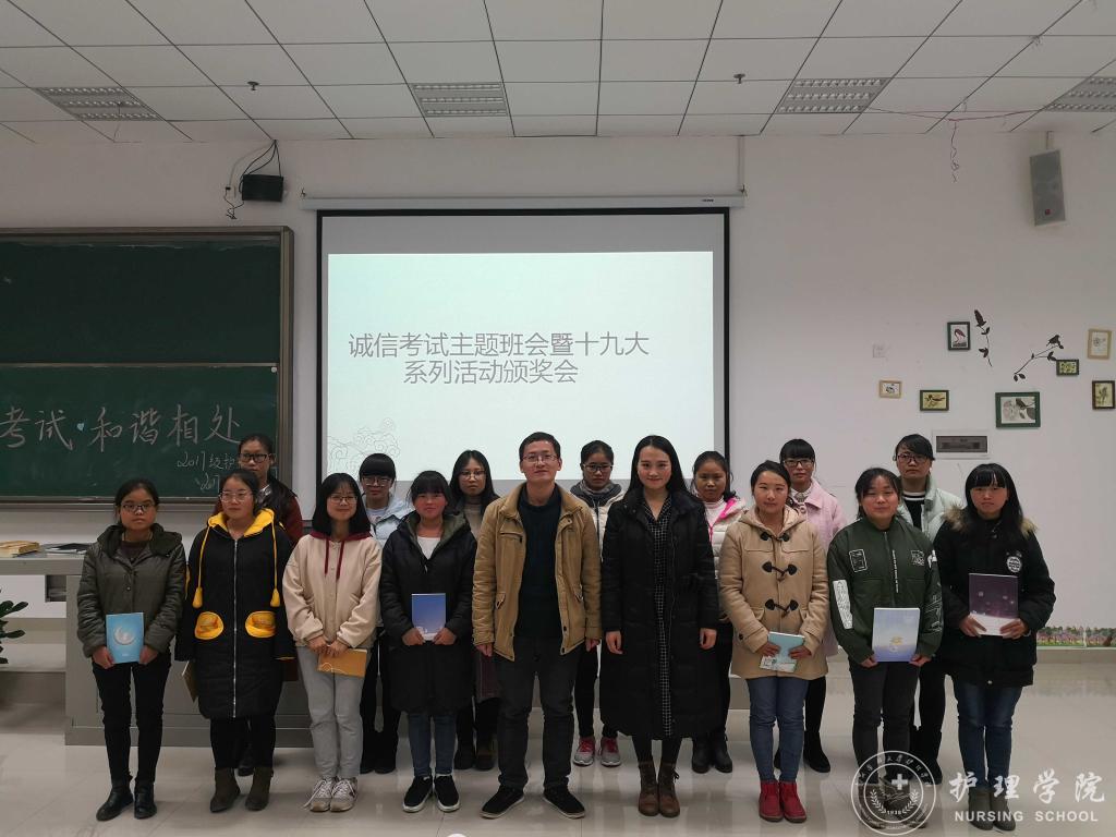12月21日晚,williamhill中国官网入口在南校区7404和7406教室开展诚信考试主题班会暨十九大系列活动颁奖仪式。此次班会由班主任吴俊、王丽,辅导员马景瑶和班级学习委员主讲,2017级护理甲班、乙班全体同学参加,班会由各班班长主持。
