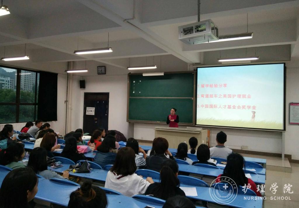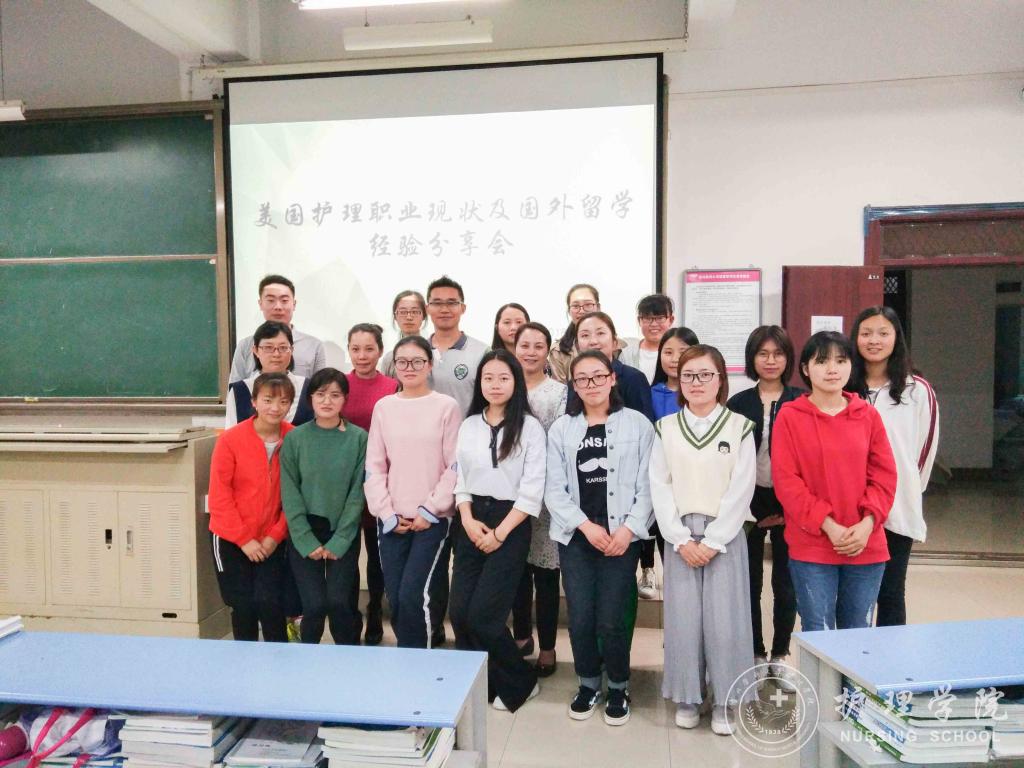 2018年5月31日下午7:00,williamhill中国官网入口于北校区2401教室召开了“美国护理职业现状及国外留学经验分享会”,分享会邀请到美国海格斯大学出国留学区域负责人彭冰老师为公司员工进行了交流指导,williamhill中国官网入口党委副书记杨英、护理技能实验室主任周谊霞、员工科科长曾敏、辅导员李杏春和2014、2015级部分同学参加了此次交流会。会议由周谊霞老师主持。