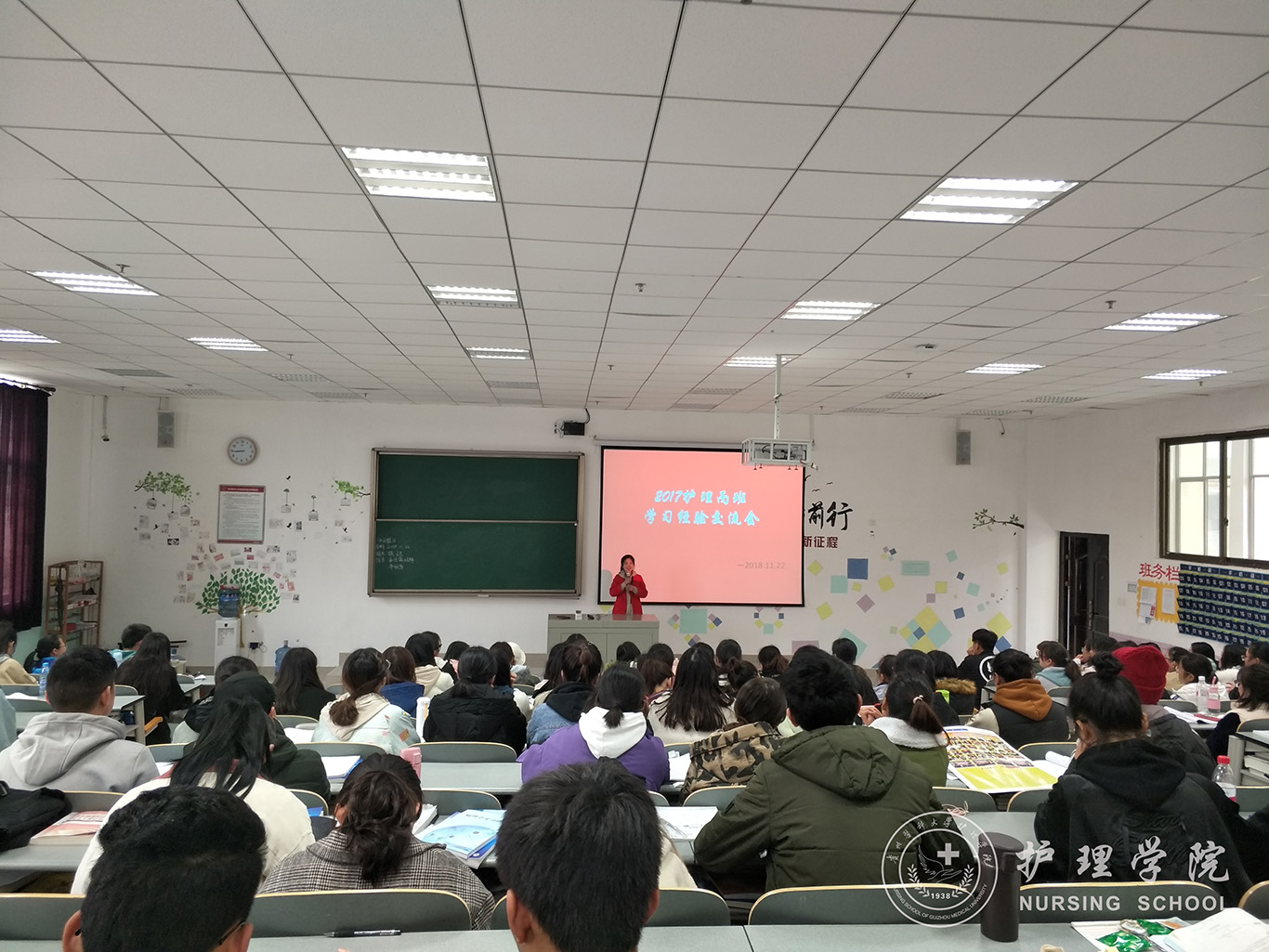 11月22日下午,williamhill中国官网入口分别在南校区7405、1302教室开展学习经验交流主题班会,本次班会邀请2015级护理学专业王洁、高汝琪两位同学主讲,辅导员王晓玲老师和班主任李宇老师、罗晶老师以及护理学2017级丙班和2018级丙班全体同学参会。