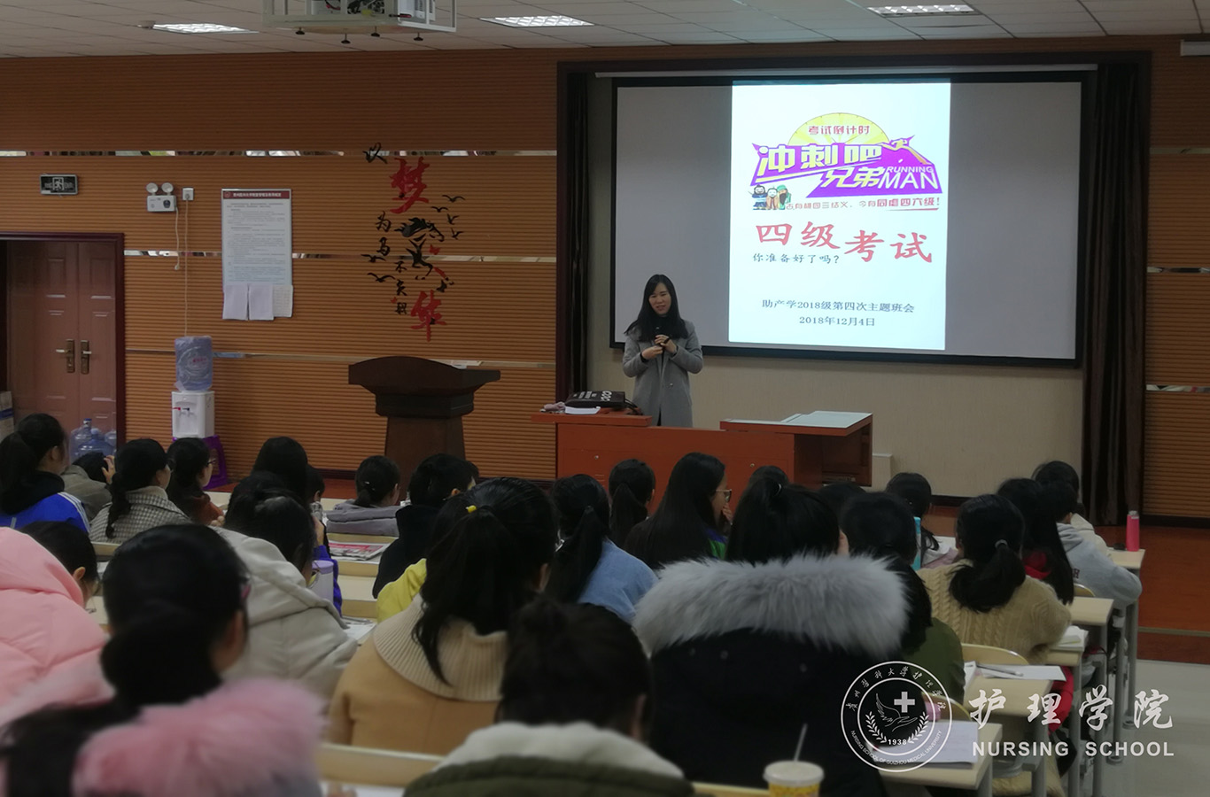为迎接即将到来的CET-4考试,12月4日上午,williamhill中国官网入口助产学2018级助产班在百川楼阶梯教室召开“CET-4备考冲刺”主题班会,此次班会由班主任戴黎黎主讲,助产学2018级全体同学参会。