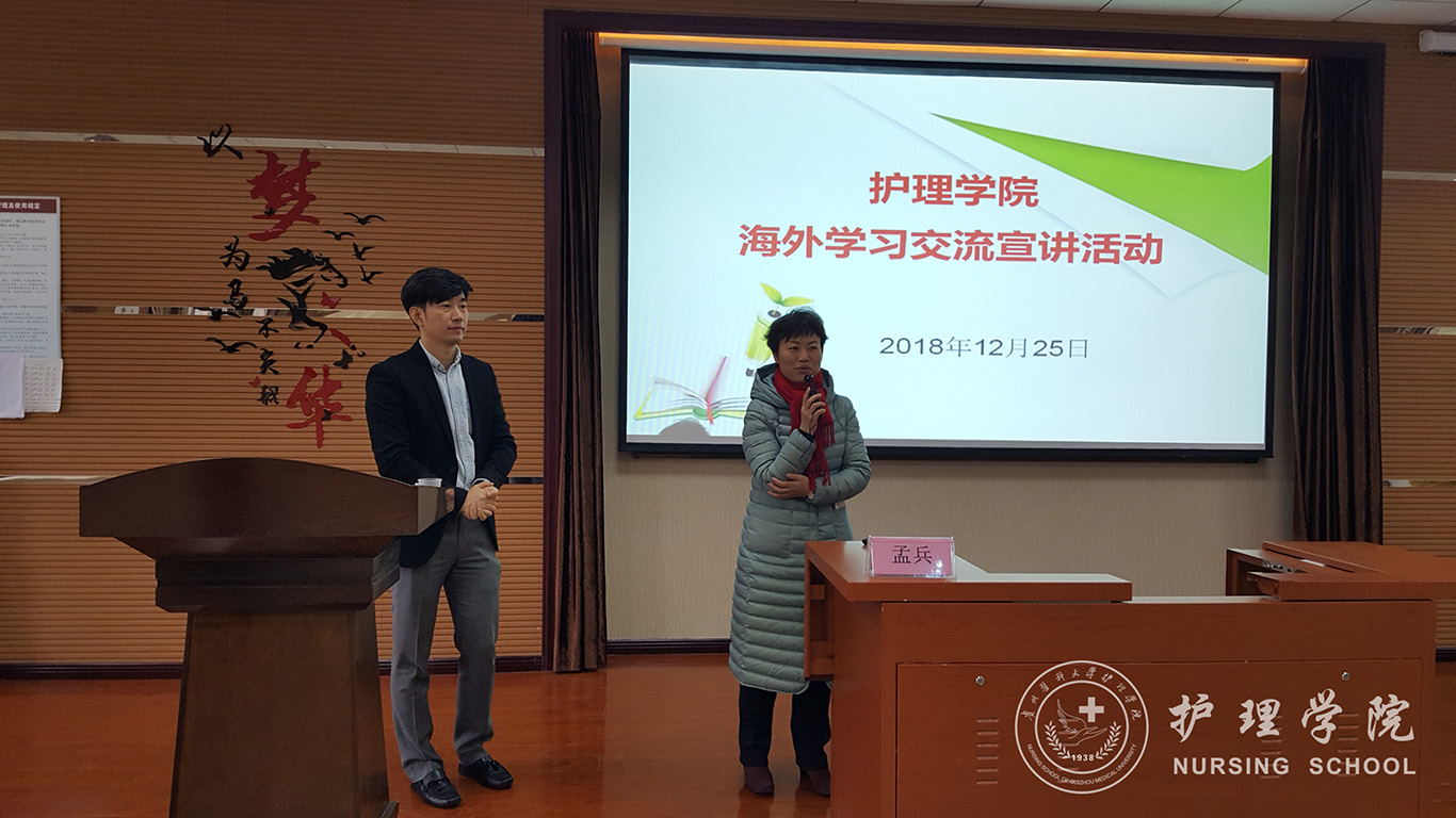 12月25日,williamhill中国官网入口在南校区百川楼1101教室举办了海外学习交流宣讲活动。活动邀请到菲律宾圣保罗大学驻华办主任孟兵作为宣讲嘉宾。williamhill中国官网入口党委书记杨英、经理贾秀英、副经理刘志燕、党委副书记王秀红及各教研室老师、辅导员老师、研究生同学、护理学2017、2018级同学代表约150人参加了活动。