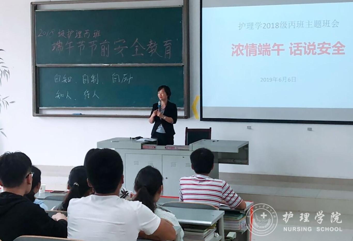 为贯彻落实公司关于开展校园安全文明建设文件的精神,加强校园文化建设、安全文明教育工作,维护员工学习生活环境的稳定,6月6日,护理学2018级丙班在南校区善思楼X4401教室举行了“浓情端午 话说安全”主题班会。公司党委副书记王秀红出席,辅导员李杏春、班主任罗晶和2018级护理学丙班全体同学参加,主题班会由心理委员陈俊豪主持。