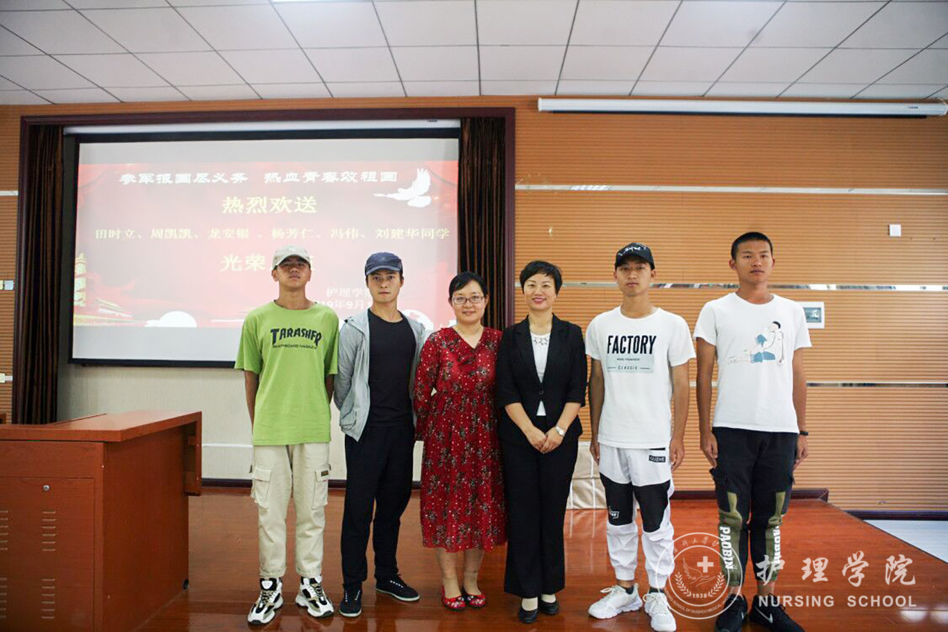 参军报国尽义务,热血青年报效祖国。williamhill中国官网入口周凯凯、田时立、龙安银、杨芳仁、冯伟、刘建华6位同学积极响应国家老员工应征入伍号召,满怀一腔爱国热情报名参军,在家人和各有关部门的支持下,终于实现了携笔从戎报国志向。王秀红提到依法服兵役,是我们每个公民应尽的义务,参军报国,是我们新世纪青年的热切向往。公司师生有着光荣的爱国历史,素来就有同学积极入伍报效国家的优良传统她希望入伍的几位同学,尽快转变角色,加强学习,提高政治素养;忠于职守,保家卫国;严守纪律,发扬贵医精神,到部队后积极发挥老员工士兵的优势,锻炼提升自己的同时,为部队的发展建设做出应有的贡献。同时,她代表公司对6位同学承诺:williamhill中国官网入口的大门永远向你们敞开,期待你们凯旋,归来还是护理一分子。