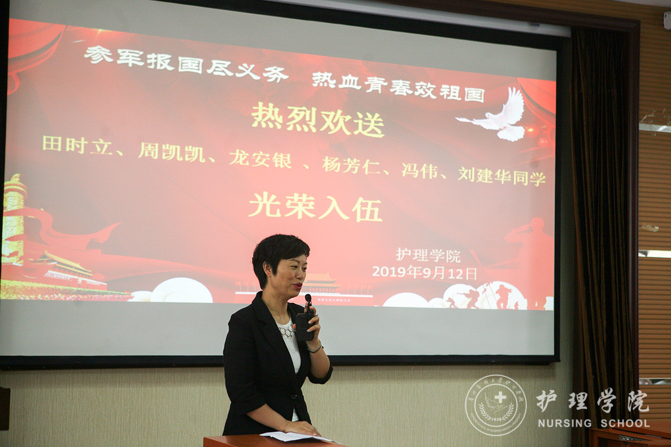 9月12日williamhill中国官网入口在南校区百川楼1101教室举行了2019年入伍新兵欢送仪式,williamhill中国官网入口党委副书记王秀红代表公司领导班子及全体教职员工生表达了对2019年老员工应征入伍即将出征的周凯凯等6位同学依依惜别之情和殷切的期望。2018级辅导员李杏春及2018级同学一起见证了这感人的时刻。