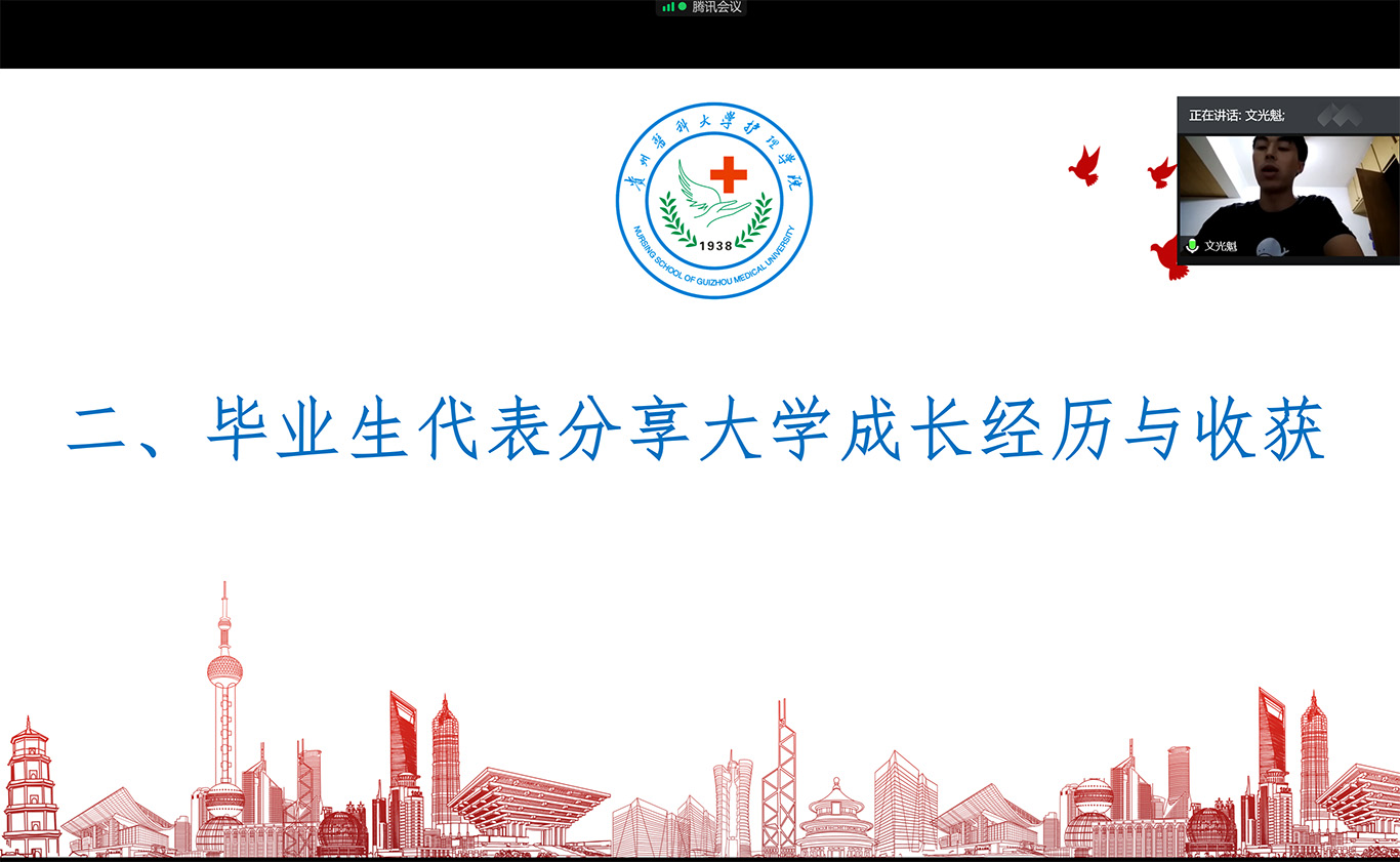 接下来,2020届毕业生文光魁、王伟月、王容三位同学作为毕业生代表分享了大学四年在贵医的成长经历与收获。跟着三位同学的分享,大家共同回忆进入贵医后的点点滴滴,回味了老员工活中的喜怒哀乐,追忆青春、畅想未来。三位同学代表全体2020届毕业生感谢williamhill中国官网入口全体老师、感恩贵医,同学们决心将大学的美好记忆带到工作岗位,不忘初心,砥砺前行。
