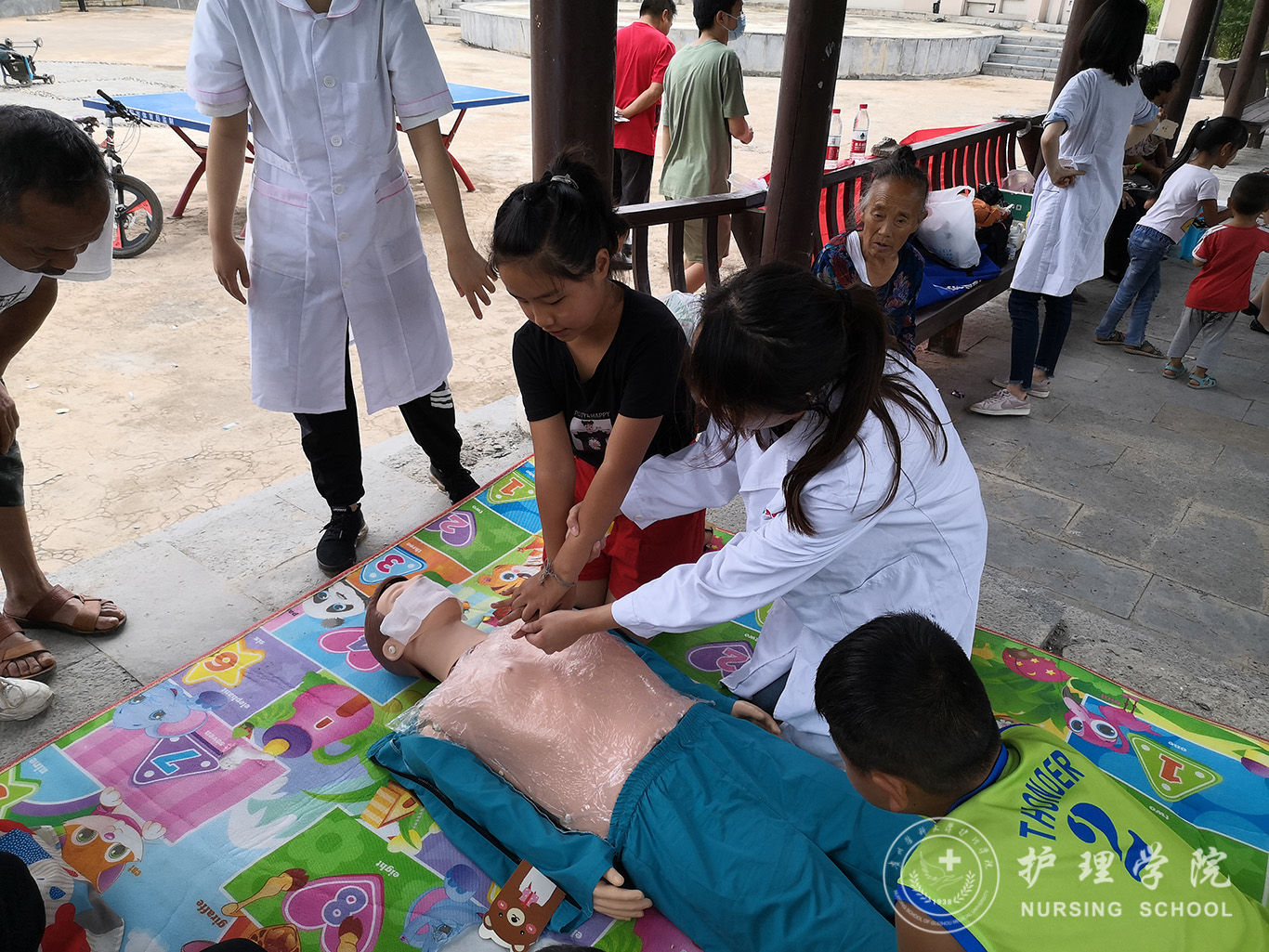 第二天,队员们早早来到村里。村子外面的小河一到夏天是孩子们戏水玩耍的去处。这一天的主要活动,就是针对儿童进行防溺水安全和相关急救技术培训。队员们利用带去的仿真模型,召集村里的孩子和家长们,展开了生动的讲解和现场示范。心肺复苏、海姆立克急救这些生活中必备的急救技术通过队员们的教授和现场训练让孩子们学会了如何处理紧急情况、增强了人身安全保护意识。培训活动结束,队员们给孩子们分发了口罩、体温计、学习文具等物资,和他们在一起做游戏、讲医护人员抗击新冠肺炎疫情的感人事迹、组织糖果分享会,一天的活动在孩子们的欢笑声中落下帷幕。