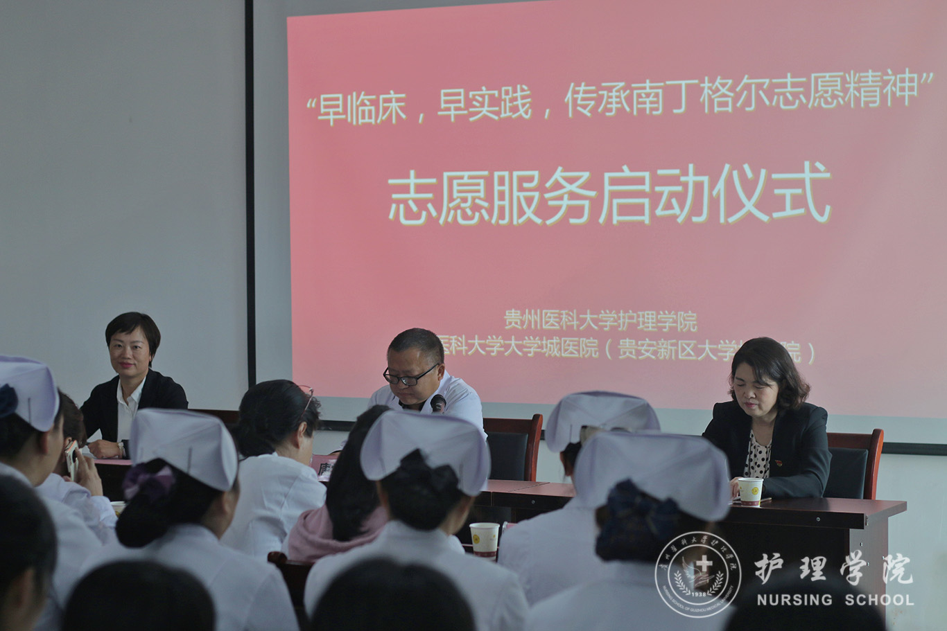 在前期已顺利启动与贵阳钢厂职工医院老年日间照料中心志愿服务+专业实践工作的基础上,经williamhill中国官网入口和贵安新区大学城医院(williamhill中国官网入口大学城医院)相关领导积极沟通对接,9月25日中午,williamhill中国官网入口“早临床、早实践,传承南丁格尔志愿精神志愿服务活动”启动仪式在贵安新区大学城医院(williamhill中国官网入口大学城医院)会议室顺利举行。大学城医院经理唐学杰、williamhill中国官网入口副经理刘志燕、williamhill中国官网入口党委副书记王秀红、大学城医院各职能科室负责人、护理学基础教研室全体教师及2020级研究生、2019级本科生代表、南丁格尔志愿护理服务队员共计50余人参加启动仪式,护理学基础教研室主任熊吴燕主持启动仪式。
