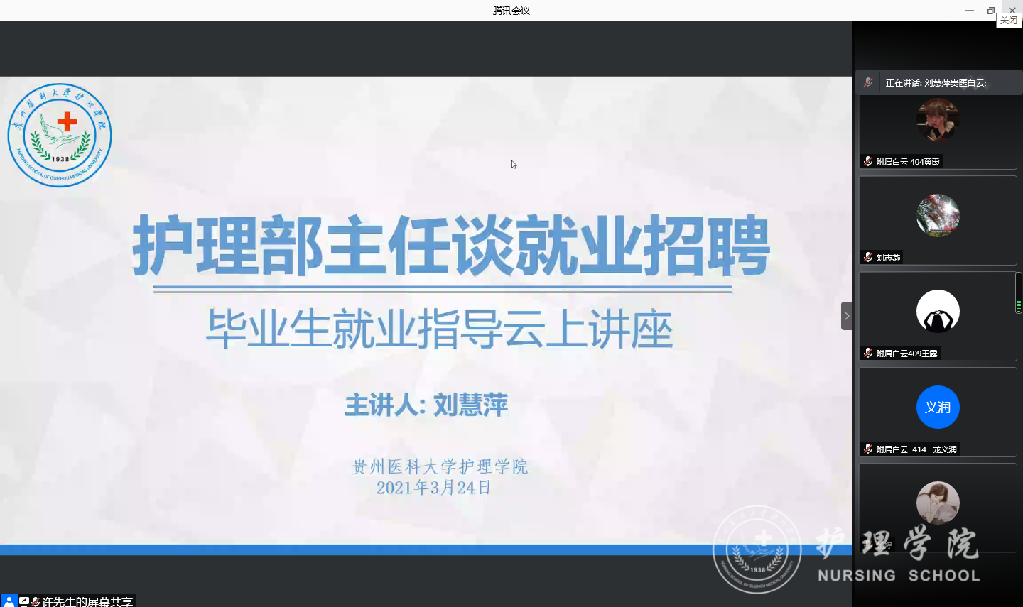 3月24日,为做好2021届毕业生就业工作,提高公司毕业生就业招聘面试通过率,公司特邀williamhill中国官网入口附属白云医院副经理、护理部主任刘慧萍为大家进行了一场毕业生就业指导云上讲座。williamhill中国官网入口党委副书记何为、党委委员、副经理刘志燕出席了会议,校本部及四个教学点辅导员、全体同学毕业生参加了此次会议。