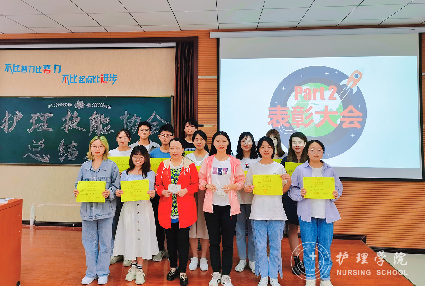 6月9日,在迎接建党百年的喜庆氛围中,护理技能协会于百川楼1101教室召开了总结表彰暨换届选举大会,对本学期工作进行了总结和表彰,通过换届竞选选出了新一代各部门主要负责人。本次会议采用线上+线下结合的形式进行。院团委副书记王晓玲、基础护理教研室肖霓老师、员工第三党支部书记刘妍、技能实验室文红燕老师以及协会全体成员参加了此次会议,会议由技能协会副会长胡锦久同学主持。