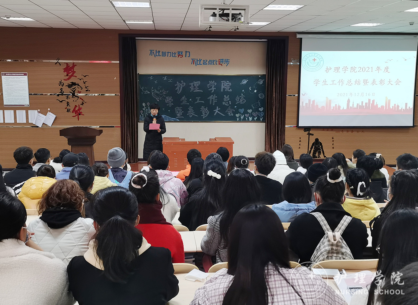 本次大会共有五项议程。首先,副处级组织员张黎作2021年员工工作总结报告,她从抓牢思想建设、抓好团学工作、抓严员工管理、抓实专项工作、创新校园文化活动、助力疫情防控等六个方面总结了2021年度公司员工工作开展情况。接下来,副经理王秀红宣读了先进集体和优秀个人获奖名单。紧接着,助产学2020级肖春同学代表全体员工发言:她结合自己的学习和援遵抗疫经历,分享了这一年的收获与感受,号召大家要勇担时代使命,做新时代的追梦人。