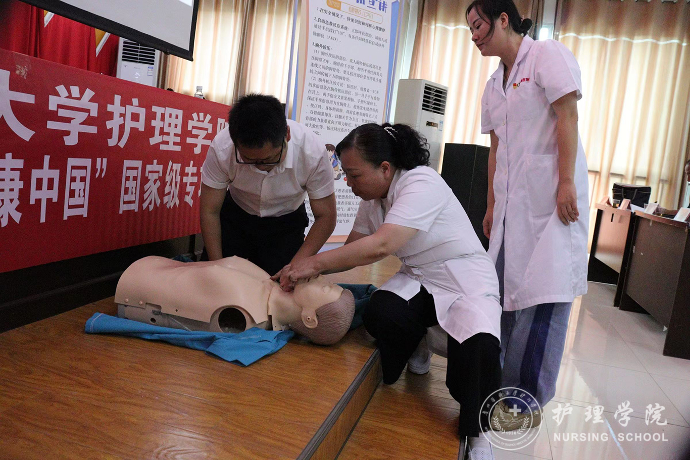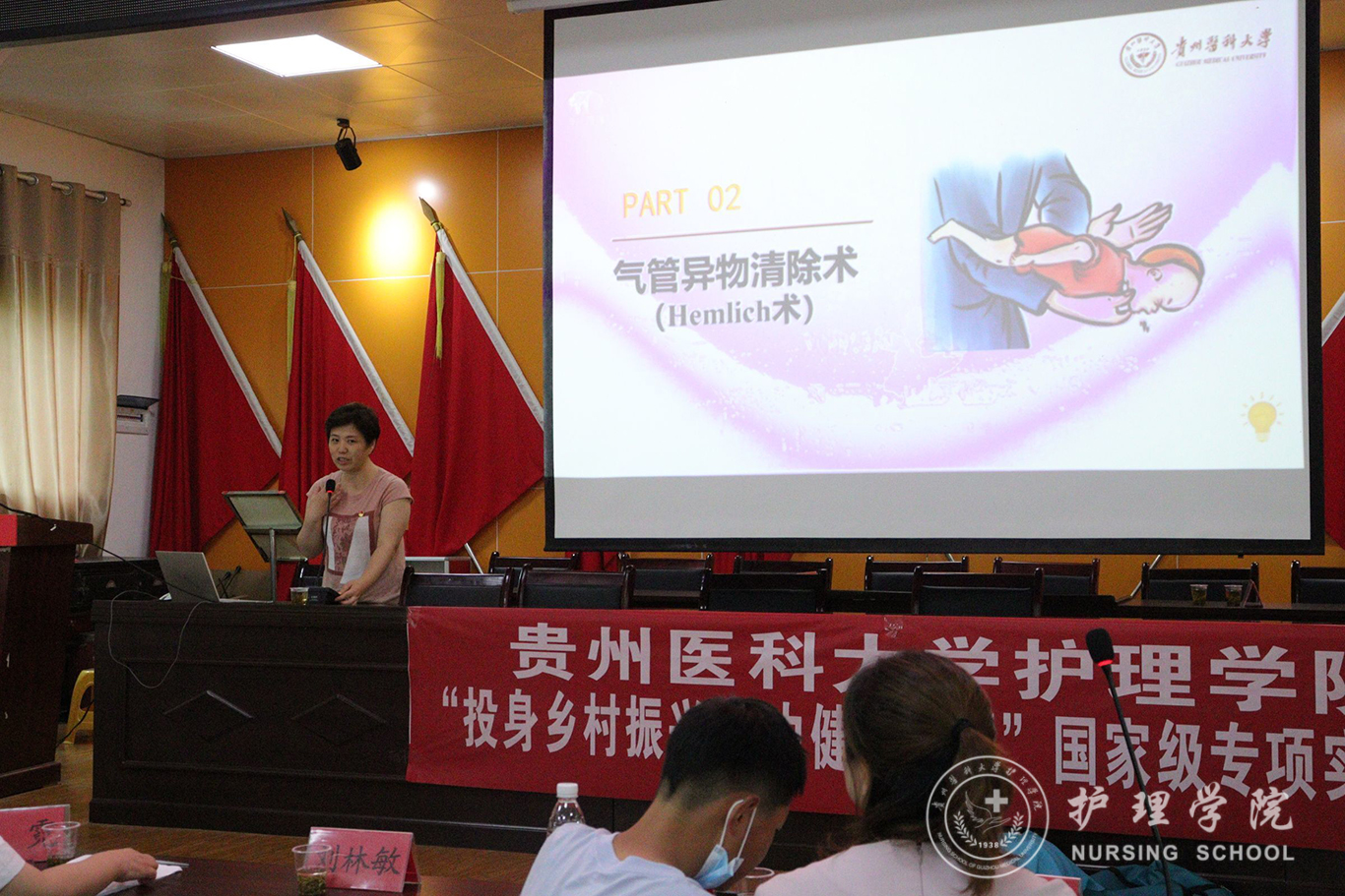 仪式结束后,公司教师党员代表张仁莉、晏家芳、刘林敏、肖霓及2022年暑期三下乡社会实践服务队的同学向蕉溪镇人民政府全体职工及各村负责健康建设工作的干部开展了健康知识讲座,对海姆立克急救法、心肺复苏术等急救技术进行了宣讲。