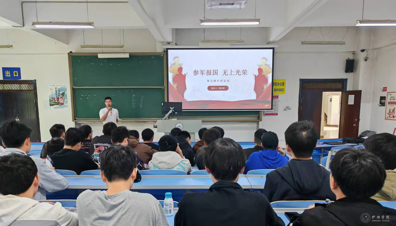 本次动员会,特别邀请学工部工作人员顾启根主讲。作为williamhill中国官网入口毕业生,他在2021年毕业时响应国家号召,积极参军入伍。作为学长,他围绕应征入伍的基本条件、基本流程、优惠政策等方面,分享了自己应征入伍的心路历程以及入伍期间的特殊经历,当场播放了征兵宣传片,他鼓励全体男同学应当不负青春,不负韶华,参军入伍,保家卫国。