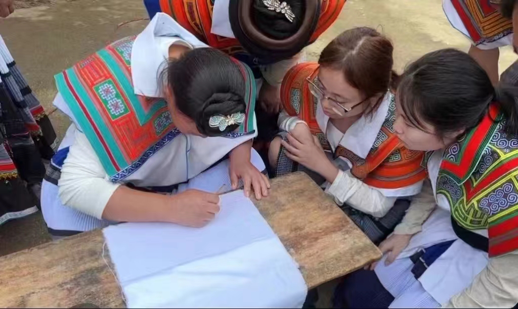 7月16日,当地手艺人提前准备了已经做好的蜡染成衣,让实践队队员“沉浸式”的体验到了民族服饰带来的魅力。蜡染环节共分为前期准备→练布→安排底色→点蜡绘制图案→染色→脱蜡→清洗七步骤,手艺人表示,在点蜡绘制图案的过程中,可以不使用测量工具直接在布上绘制直线以及图案,将制作人对生活的期望和对未来的美好祝愿都绘制在了布里。实践队队员们不仅现场学习了点蜡技艺,还体会到了“守艺人”们始终如一的匠人精神。