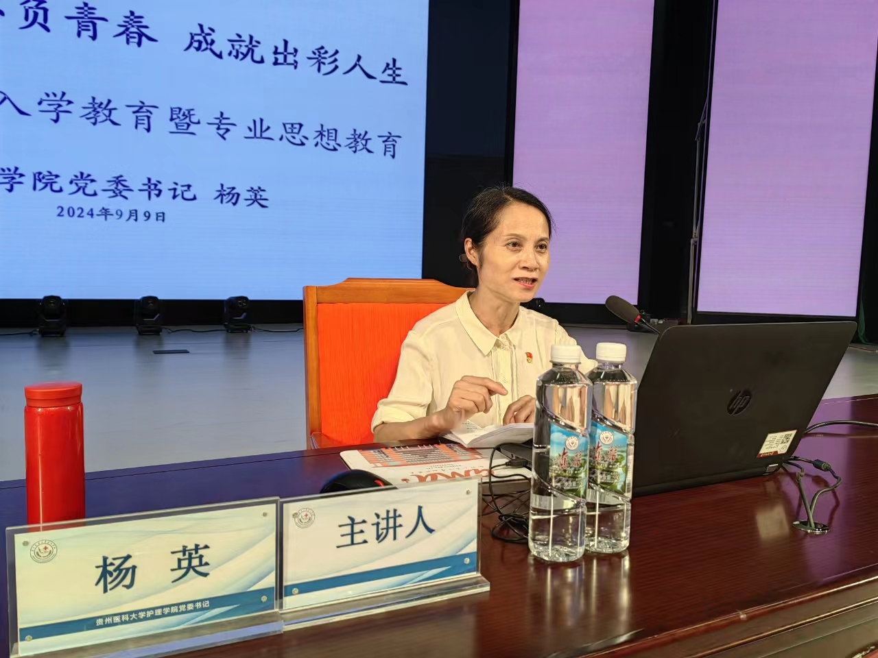 紧接着,杨英以《珍惜韶华 不负青春 成就出彩人生》为题,从现代护理学的诞生、护理学的发展、人生规划与专业发展四个方面结合历届南丁格尔奖章获得者的事迹,引导全体同学追随前辈脚步,感悟精神实质,传承发扬南丁格尔精神,扬起实干风范,燃起拼搏之质,勇担新时代使命,确立为患者服务的远大理想和争当“白衣天使”的奋斗目标,珍惜大学时光,将个人的奋斗追求融入党和国家事业建设之中,努力使自己成为有理想、敢担当、能吃苦、肯奋斗的新时代好青年,为建设富强民主文明和谐美丽的社会主义现代化强国做出自己的贡献。