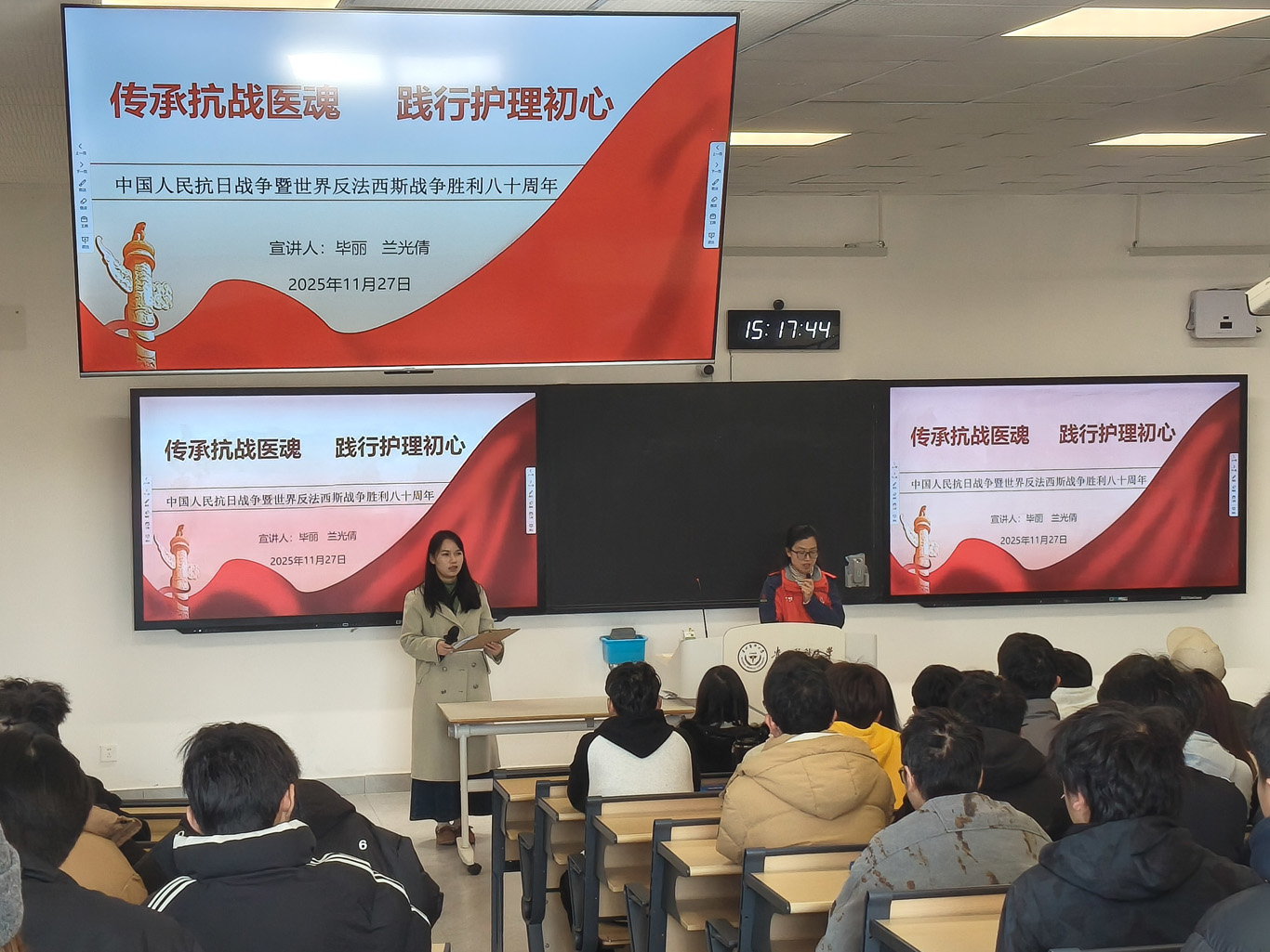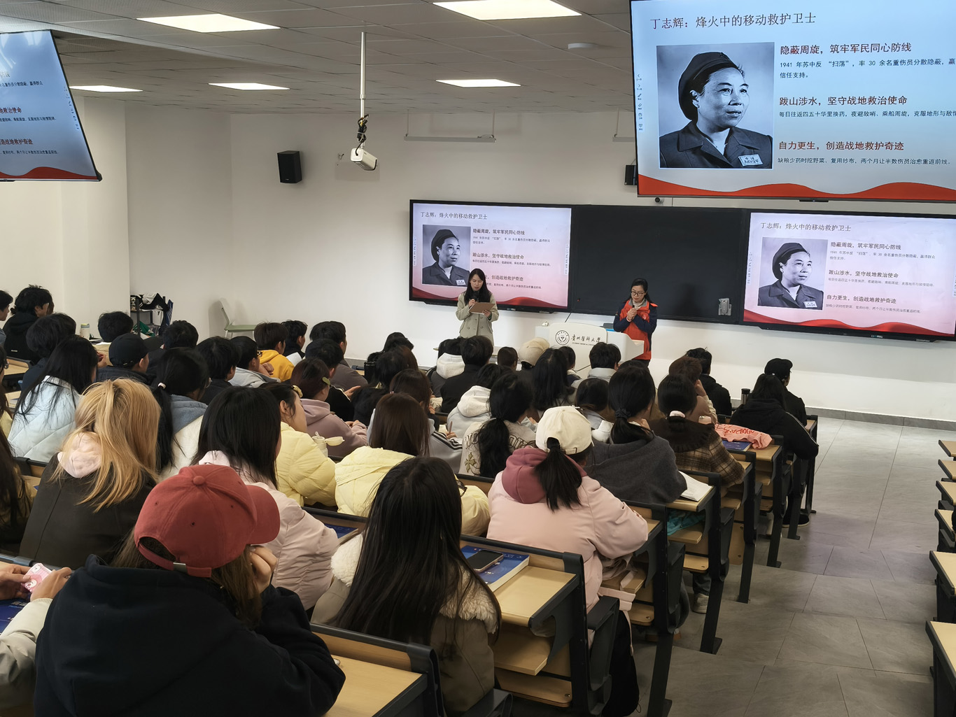 本次宣讲活动以“红色医魂”为纽带,带领同学们重温抗战时期护理先辈们的峥嵘岁月。通过抗战医护先辈章央芬倾心诊治患者、丁志辉坚守一线救死扶伤等鲜活事迹,以及众多“战士生命守护神”的感人故事,为同学们明晰了学医的初心和方向,让大家深刻体悟到了“医者仁心”的厚重内涵。此外,宣讲还设置互动环节,紧紧围绕如何将抗战先辈“苦中坚守”的精神内核转化为当下“学以致用”的生动实践这个话题展开交流,同学们踊跃发言、各抒己见。
