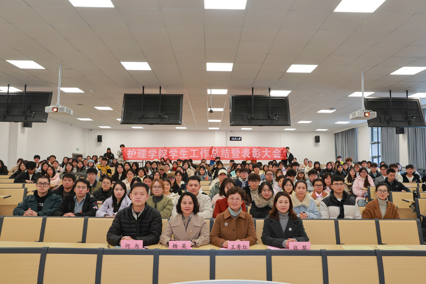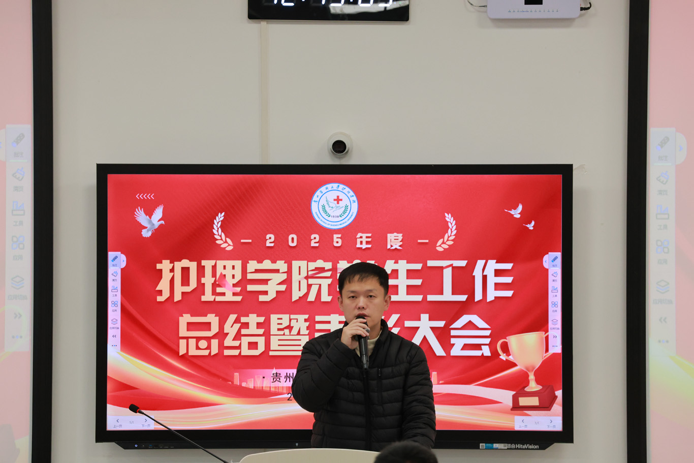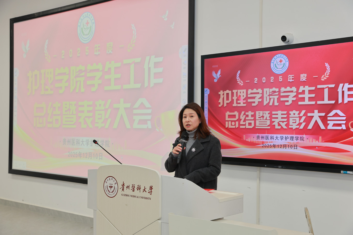 杨英作总结讲话。她首先向受到表彰的集体与个人致以热烈祝贺,向辛勤耕耘在员工工作一线的教职工表示衷心感谢。随后,她以“贵医护理的历史传承与时代成就”为切入点,带领师生回顾公司发展历程,引导同学们厚植专业情怀;围绕“坚定新征途、凝聚成长力量”,强调以专业情怀滋养个人成长,将个人发展融入公司建设与行业发展大局。杨英对全体同学提出三点要求:一是坚守医者情怀,涵养仁心大爱;二是坚持勤学不辍,锤炼过硬本领;三是勇于直面挫折,永葆奋进姿态。