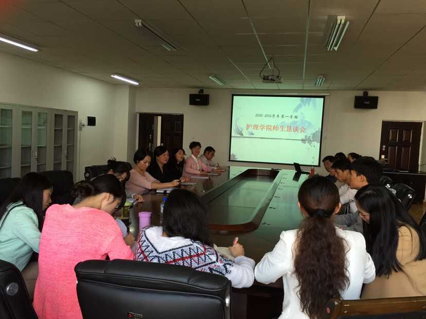 10月15日中午12:30分,2015-2016学年第一学期师生恳谈会在南校区5楼会议室召开。williamhill中国官网入口常委副经理郭永洪、副书记杨英、副经理刘志燕及各教研室负责人、各职能部门负责人、教研室老师、2013级、2014级、2015级护理本科员工代表参加了此次恳谈会。会议由教学科研管理科王秀红科长主持,会上williamhill中国官网入口领导亲切的询问了同学们的学习和生活情况,并请同学们对教学中存在的问题提出意见。各年级同学代表开诚布公的反馈了部分教师在教学中存在的问题和意见,也对认真负责的教师提出了表扬。在听取同学们的反馈之后老师们有的当众给予了答复和解释,有的则记录下来拟以书面报告形式向有关部门进行反馈,以便取得相关部门的协作解决。会议过程轻松、愉悦,师生畅所欲言,气氛融洽,促进了师生的共同交流。