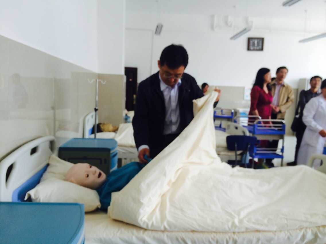 高斌副处长认真查看模拟病房模型人的使用情况。