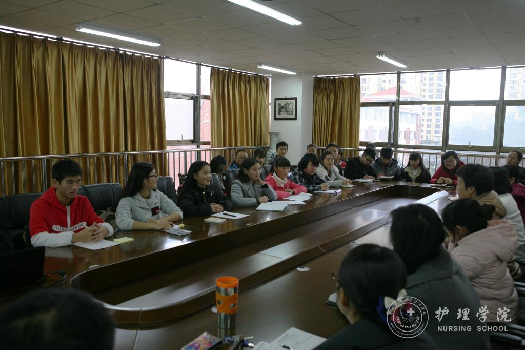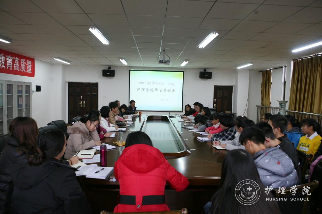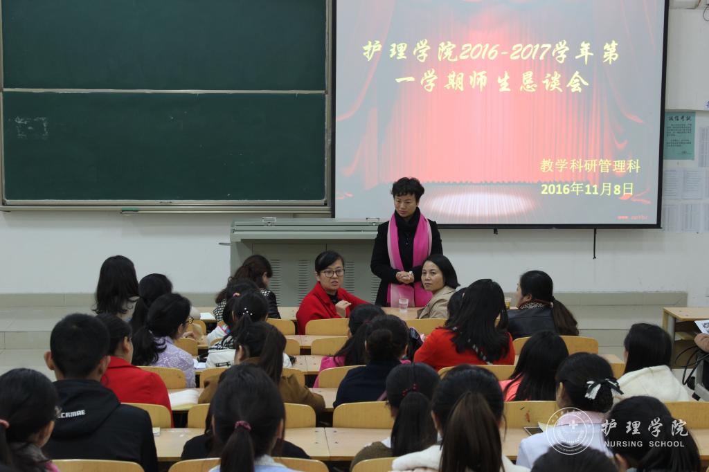 2016-2017学年第一学期师生恳谈会分别于11月8日、9日在北校区4101教室及南校区5楼会议室召开。williamhill中国官网入口党委副书记杨英、副经理刘志燕及各教研室、职能部门负责人、教研室老师及来自临床的教学老师,2014级、2015级、2016级护理学本科班及护理学(助产方向)员工代表参加了此次恳谈会。