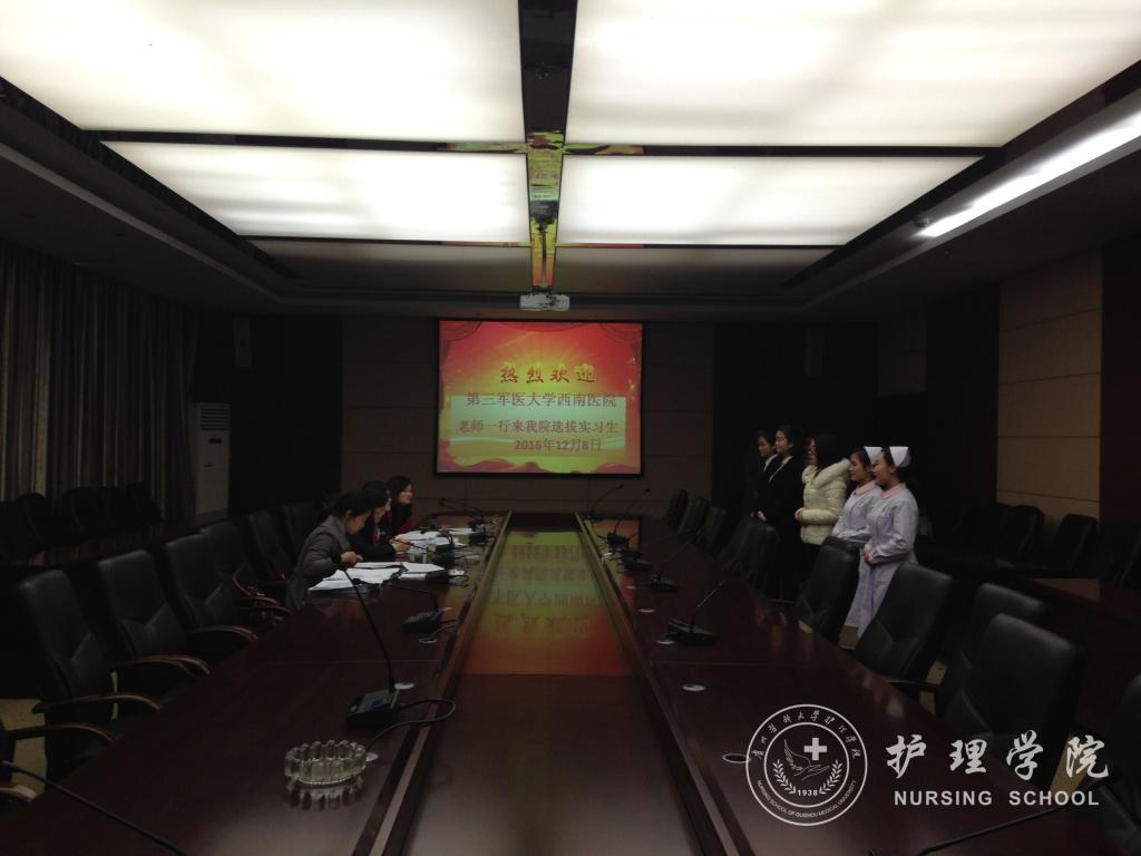 12月8日第三军医大学西南医院护理部郭上铃助理等一行四位老师来公司williamhill中国官网入口开展选拔意向性实习生工作。公司分管教学副经理刘志燕、生产实习科科长柳忠燕老师、辅导员李杏春参加了此次选拔工作,共有八十余名2014级护理本科(含助产专业、专升本)同学参加本次实习生选拔。