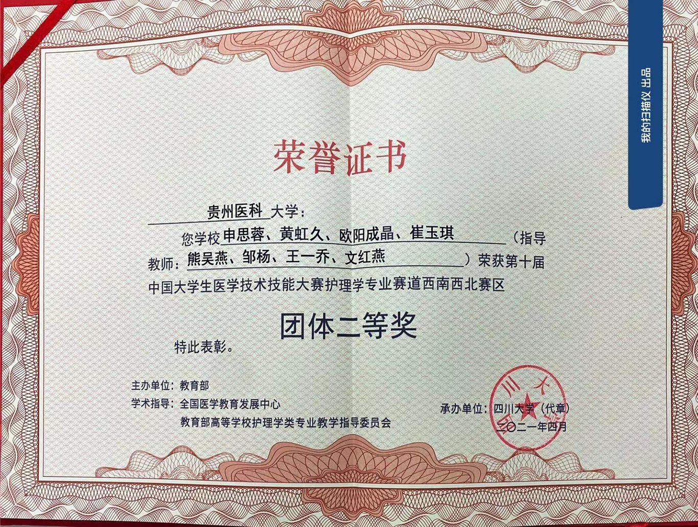 4月17-18日,由教育部主办、教育部高等公司护理学类专业教学指导委员会学术指导、四川大学承办的第十届中国老员工医学技术技能大赛护理学专业赛道西南西北分区赛中,由公司2017级护理专业员工申思蓉、黄虹久、欧阳成晶、崔玉琪组成的williamhill中国官网入口代表队,经过两天紧张而激烈的角逐,以扎实的基本功和出色的表现,荣获团体二等奖。