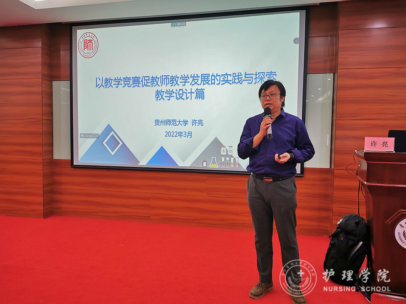 此次培训特别邀请到贵州师范大学贵州省教学名师、全国高校青年教师教学竞赛一等奖和全国高校教师教学创新大赛一等奖获得者许亮教授作为主讲嘉宾。许亮教授结合自身经验,从教学竞赛方面为大家深入浅出地讲述了教学发展的实践与反思。为期3天的培训,专家和老师们主要围绕教学组织、教学设计、教学方法、教学评价及教案的书写等环节为大家开展精彩的专题讲座,会场座无虚席、学习氛围浓厚,与会者们受益匪浅。