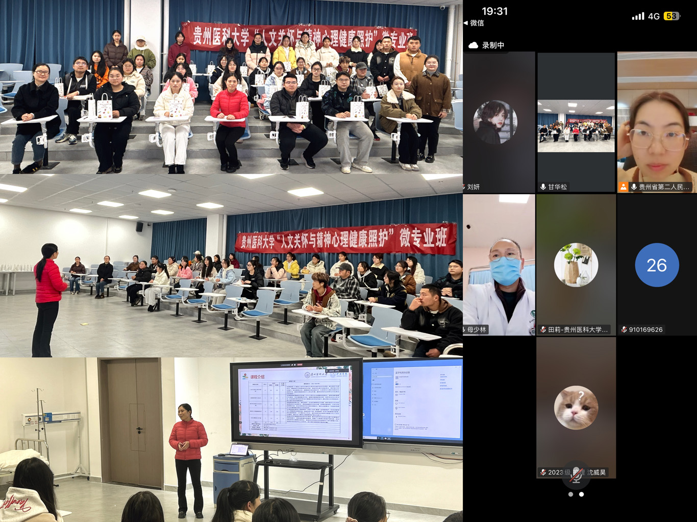 为积极响应国家加强精神卫生服务体系建设的号召,适应新时代精神健康服务需求,培养兼具专业技能与人文关怀素养的健康照护人才,williamhill中国官网入口开设的“人文关怀与精神心理健康照护”微专业于11月3日在云漫湖校区临床组团酬勤楼示教室举行了开课仪式。开课仪式采用线上线下相结合的方式进行。护理人文教研室主任张仁莉,教师李红、刘妍以及williamhill中国官网入口附属医院心理精神科护士长田莉、精神专科护士母少林和甘华松、贵州省第二人民医院康复科主任刘义、课程秘书覃启柔等微专业团队老师以及32名微专业学员共同参与。