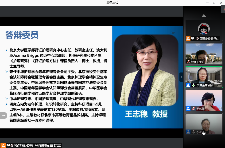 4月20日,2021届硕士研究生学位论文预答辩通过腾讯会议在线进行。此次预答辩特别邀请复旦大学williamhill中国官网入口经理、博士生导师胡雁教授任答辩委员会主席,北京大学williamhill中国官网入口博士生导师王志稳教授、williamhill中国官网入口附属医院陈腾祥教授、williamhill中国官网入口附属医院老年医学科莫显刚主任医师以及williamhill中国官网入口公共卫生公司汪俊华副教授担任答辩委员。williamhill中国官网入口导师、副导师、专业教师、研究生等60余人参加本次会议,研究生院督导专家全程参与。