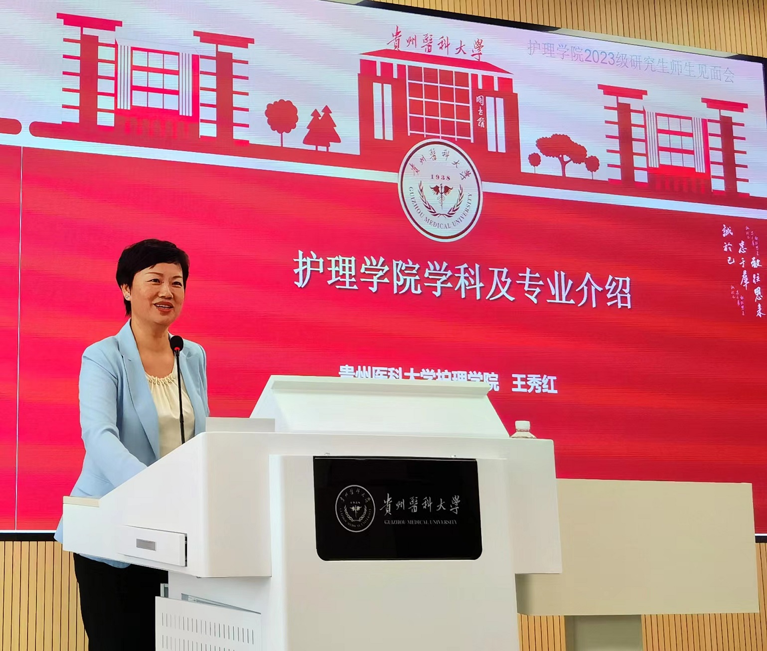 接下来王秀红给同学们介绍了公司和公司的历史沿革和护理团队建设与研究生教育的发展及现况,同时鼓励同学们传承协和精神、心怀责任担当,踏实进取,在新的征程、新的校园开启新的起点,得到新的收获,努力成为百年贵医辉煌篇章的书写人。