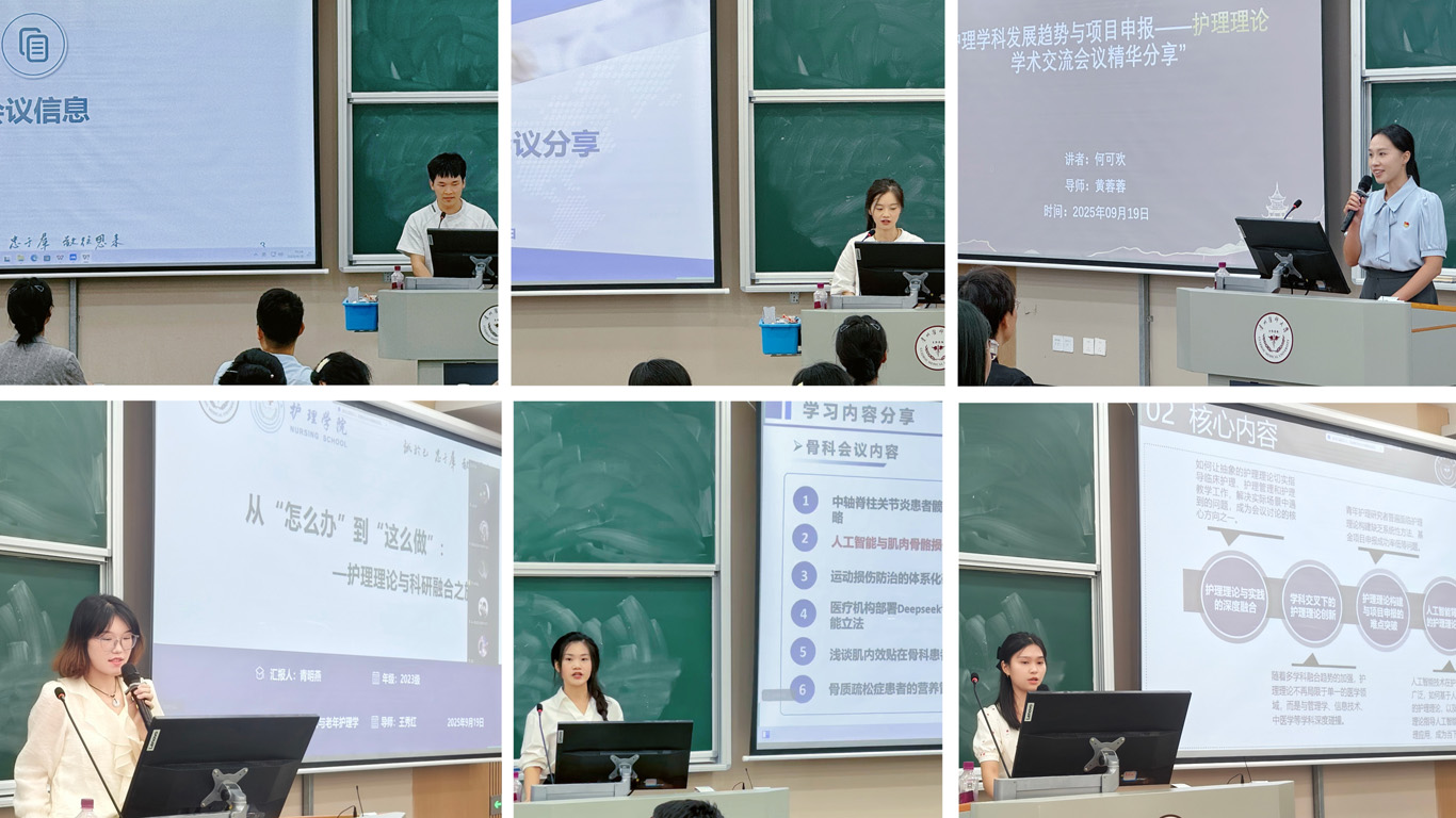 会议过程中,2023级学硕研究生青明燕分享“理论—方法—实践”三位一体模式,阐释护理理论价值并提出分类适配与文献分析策略;2023级专硕研究生王露结合乳腺癌量表案例介绍“理论框架九步法”,强调理论适配与温度把握;2024级学硕研究生何可欢转述专家对护理发展趋势、选题方向及破局之道的解读,并分享需求层次理论与人文关怀的思考;2023级学硕研究生陆珍梅介绍理论新进展与本土化研究,结合经验解读投稿流程与AI助力选题,强调理论与研究契合;2023级专硕研究生李鸿运聚焦骨科护理,分享3D打印、AI康复、MDT管理及软骨再生研究;2024级专硕研究生邓秀平解读骨科AI康复、脑脊液渗漏护理共识,介绍Orem自理理论、变革理论及潜在类别分析方法,并结合发言经历谈成长。卓英权在交流答疑中提到此次会议涵盖多个前沿领域,其中骨科专业讲座内容扎实,系统梳理并更新了从基础理论到临床实践的知识;他认为此类会议对教师专业成长和教学内容更新至关重要,同时他指出持续学习的必要性,建议员工在汇报中融入会议所学先进理念与技术。殷艳温馨提示:一是注重学术传承,参会同学要将收获分享给未能参会者,以点带面、共同进步;二是时刻警惕、确保安全,珍惜机会、心怀感恩。