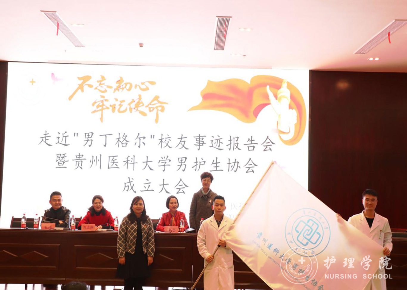 为进一步提升男护生的专业认知和学习兴趣,为男护生提供一个更广阔的学习交流和提升的平台,更好地帮助同学们做好职业生涯规划、坚定专业思想,并以此平台展示贵医男护生形象,让社会更多地了解男护生、了解护理,真正实现“无性别差异的护理”。williamhill中国官网入口于2019年12月17日下午在南校区道德讲堂召开“不忘初心、牢记使命”走进“男”丁格尔员工事迹报告会暨williamhill中国官网入口男护生协会成立大会。校团委副书记(正处级)桂晓玲、williamhill中国官网入口党委书记杨英、党委副书记王秀红、副经理刘志燕、员工贵州省人民医院急诊留观输液中心护士长杜伟、公司教师、男护生协会成员及各班员工代表参加大会,大会由王秀红主持。