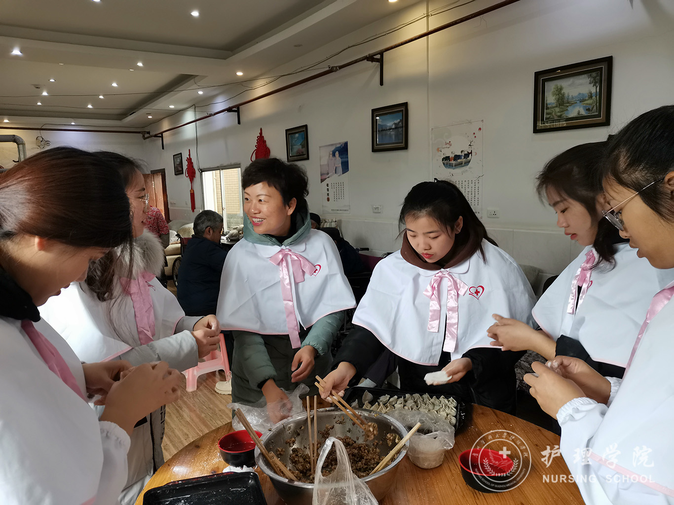 临近中午,志愿者一起动手将悉心准备的食材拿出来,为老人们包起了“爱心”饺子,来自天南地北的同学们虽然包饺子技术参差不齐,但饺子内包着的爱心却都是满满的。热腾腾的饺子飘来一屋子的鲜香,志愿者们在养老护理员的帮助下,把一碗碗饺子送到老人手里、喂到老人嘴里。老人们的笑颜表达了他们内心的真切感受。