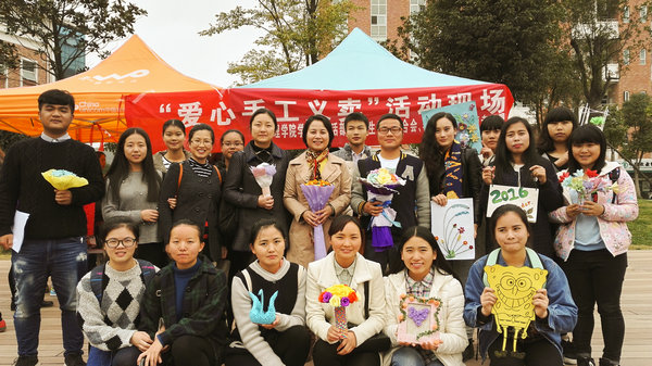 11月18日中午12点,由williamhill中国官网入口员工会生活部、老员工社团联合会、希望工程爱心社使者联盟开展的“与爱同行”手工大赛暨爱心义卖活动在“悯农堂”前开展。本次活动旨在丰富同学们的老员工活,提高大家的动手能力和创新能力,营造良好的校园文化气氛,给同学提供一个平台去奉献自己的爱心。williamhill中国官网入口党委副书记杨英、员工科科长曾敏、辅导员王晓玲、李海林、毕丽参与本次活动评选及义卖。