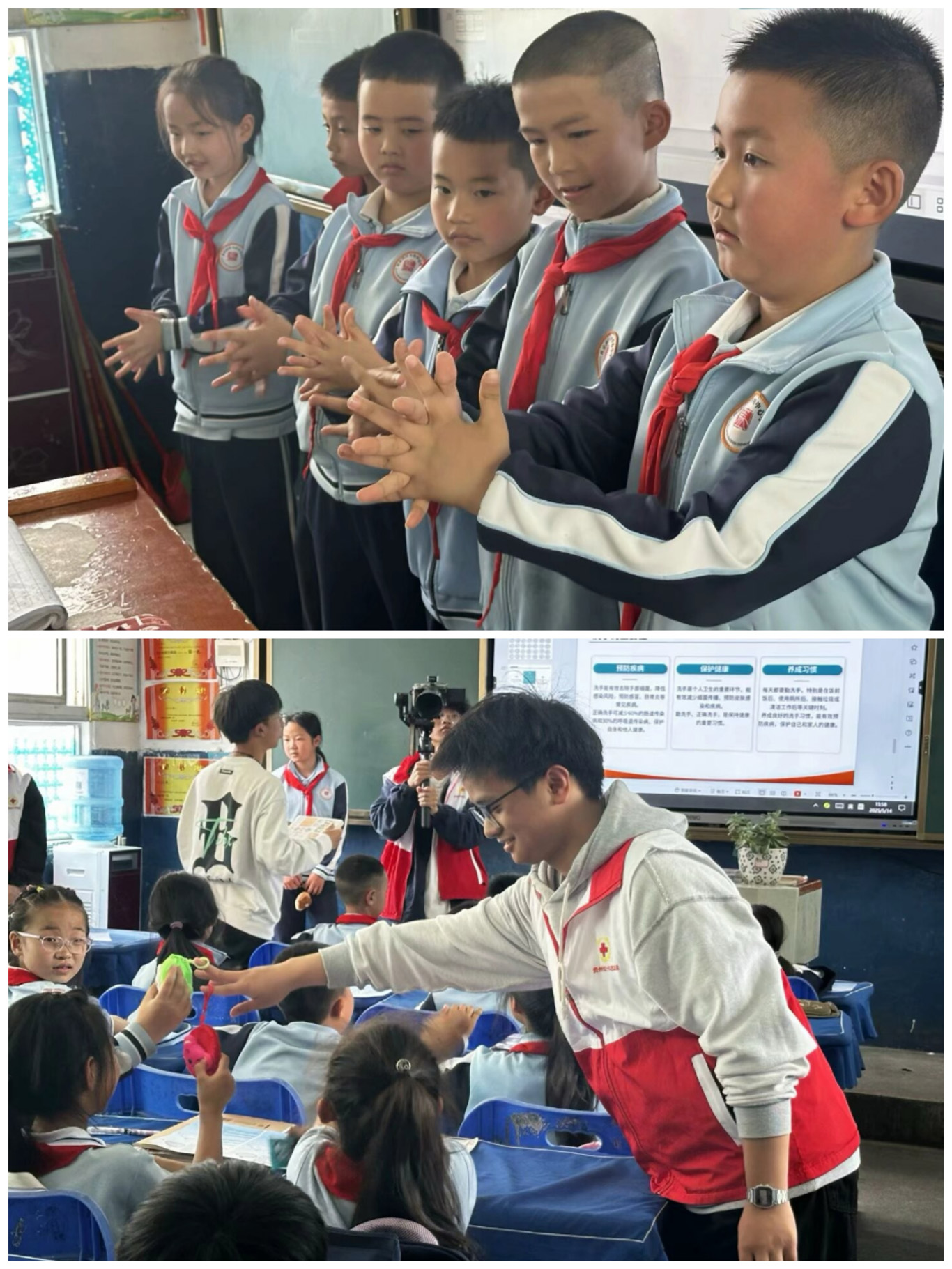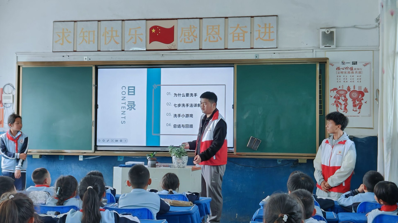 活动中,员工代表付知行、曾茗程和罗明通过多媒体课件向马场中心小学三年级(一)班的小员工们详细科普了手卫生的重要性,将手卫生知识科普与小员工日常习惯培养紧密结合,系统教学了“七步洗手法”的正确操作顺序及注意事项,创新性地采用教学小游戏与小员工们进行趣味互动,同时通过发放健康小奖品充分调动了小员工们的积极性,帮助小员工们增强卫生意识、掌握正确的洗手方法。