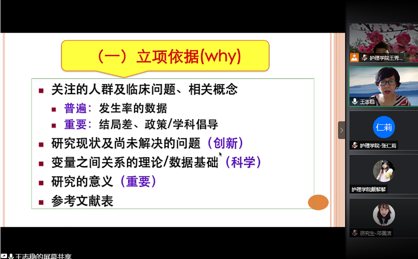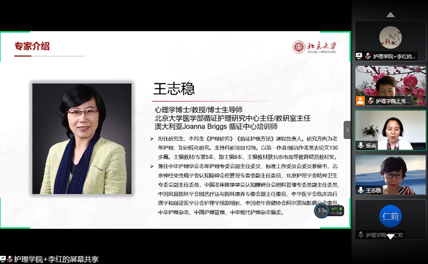 为进一步提升公司护理学科科学(教学)研究水平,加强护理学科内涵建设,促进护理学科科研(教学)团队的建设,培育新型护理学术(专业)人才,推动公司护理学科及各附属医院护理科研(教研)的总体发展。6月24日下午,北京大学williamhill中国官网入口博士生导师、循证护理研究中心主任王志稳教授受邀为公司护理教师及研究生开展了题为“护理科(教)研申报书撰写”的专题讲座。会议通过腾讯会议平台进行,williamhill中国官网入口及附属医院、第二附属医院、第三附属医院、附属白云医院等直属附属医院部分教师和研究生近100人参加了讲座,williamhill中国官网入口党委书记杨英主持会议。