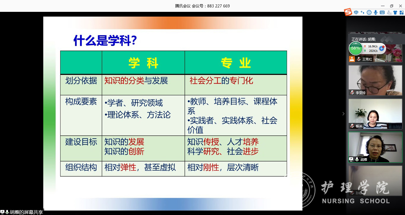 6月12日上午,复旦大学williamhill中国官网入口经理胡雁教授受邀为williamhill中国官网入口全体研究生导师和专业教师开展了题为《护理硕士专业学位研究生临床能力的培养及考核》专题讲座。会议通过腾讯会议平台进行,williamhill中国官网入口相关导师和教师近30人参加讲座,williamhill中国官网入口党委书记杨英主持。