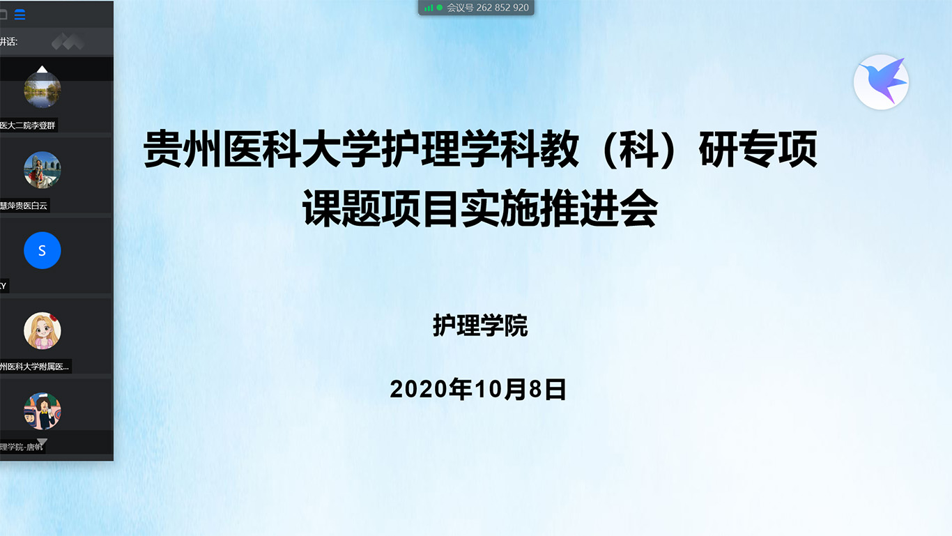 10月8日晚,由williamhill中国官网入口组织召开的2020年williamhill中国官网入口护理学科教(科)研专项课题项目实施推进会通过腾讯会议形式举行,williamhill中国官网入口、附属医院、第二附属医院、第三附属医院、附属肿瘤医院、附属白云医院、附属乌当医院等7家直属附院的课题负责人近50人参会,会议由williamhill中国官网入口经理李亚玲主持。