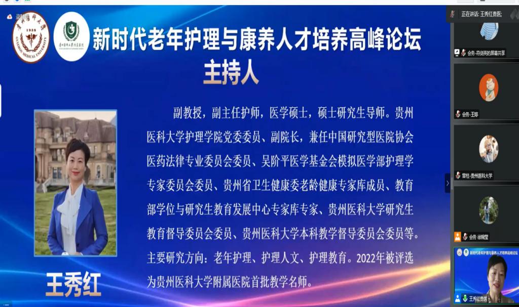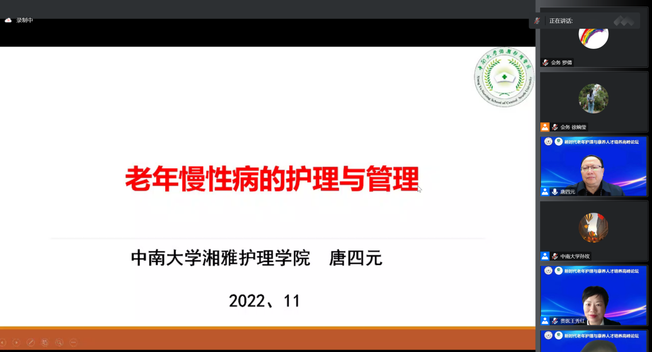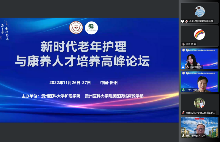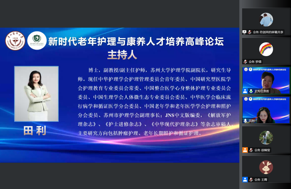 风正好扬帆,气正能聚力,在全国上下深入学习贯彻党的二十大精神之际,11月26日至27日,由williamhill中国官网入口、williamhill中国官网入口附属医院临床教学部举办的《新时代老年护理与康养人才培养高峰论坛》在云端成功举办。来自全国各地近210名专家学者、护理同仁、和高校师生齐聚云端参会。论坛由williamhill中国官网入口副经理王秀红、苏州大学williamhill中国官网入口副经理田利、中南大学湘雅williamhill中国官网入口对外合作交流中心副主任孙玫分别主持。