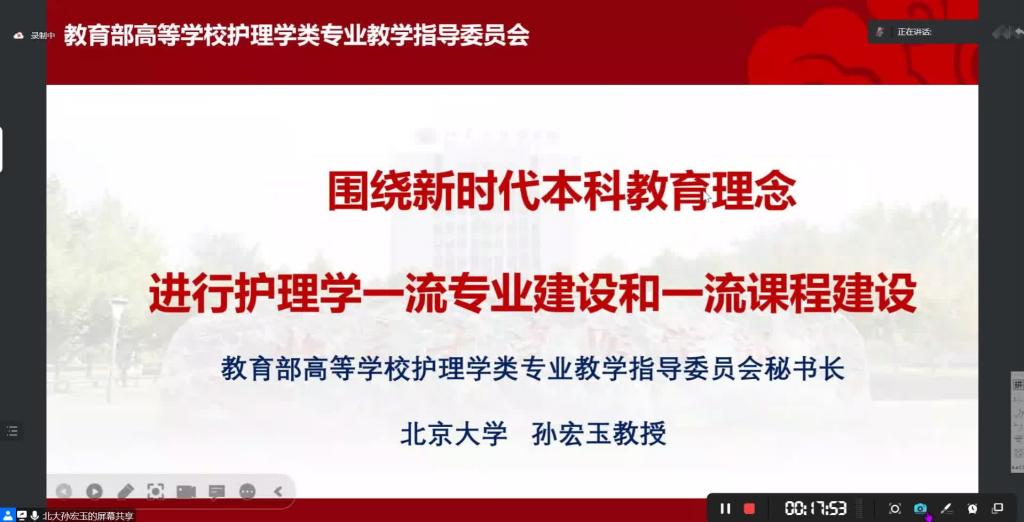 教育部高等公司护理学类专业教学指导委员会秘书长、美国护理科公司院士、北京大学williamhill中国官网入口孙宏玉教授以“围绕新时代本科教育理念,进行护理学一流专业建设和一流课程建设”为题,结合实践案例,阐述了新时代本科教育理念,从国家层面就如何建设护理一流专业及一流课程问题提出了一系列建设性指导。